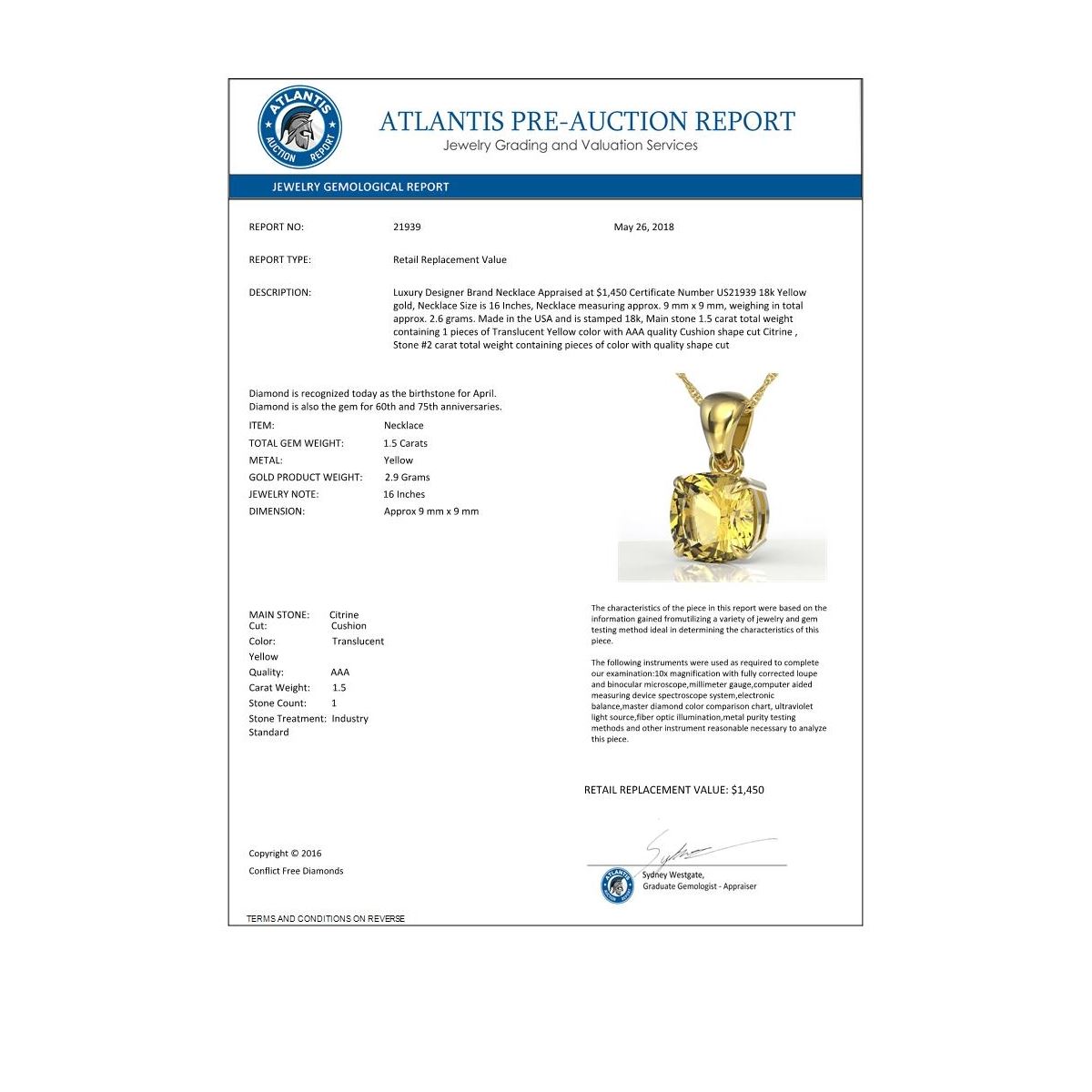 REF-24M2H -21939 ---- 1.50 Cushion Cut CTW Citrine Designer Solitaire Necklace 18K Yellow Gold ---- Luxury Designer Brand Necklace Appraised at $1,450 Certificate Number US21939 18k Yellow gold, Necklace Size is 16 Inches, Necklace measuring approx. 9 mm x 9 mm, weighing in total approx. 2.6 grams. Made in the USA and is stamped 18k, Main stone 1.5 carat total weight containing 1 pieces of Translucent Yellow color with AAA quality Cushion shape cut Citrine , Stone #2 carat total weight containing pieces of color with quality shape cut
