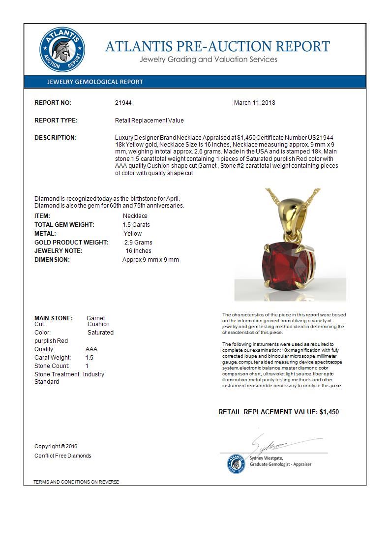 REF-24X2T -21944 ---- 1.50 Cushion Cut CTW Garnet Designer Solitaire Necklace 18K Yellow Gold ---- Luxury Designer Brand Necklace Appraised at $1,450 Certificate Number US21944 18k Yellow gold, Necklace Size is 16 Inches, Necklace measuring approx. 9 mm x 9 mm, weighing in total approx. 2.6 grams. Made in the USA and is stamped 18k, Main stone 1.5 carat total weight containing 1 pieces of Saturated purplish Red color with AAA quality Cushion shape cut Garnet , Stone #2 carat total weight containing pieces of color with quality shape cut