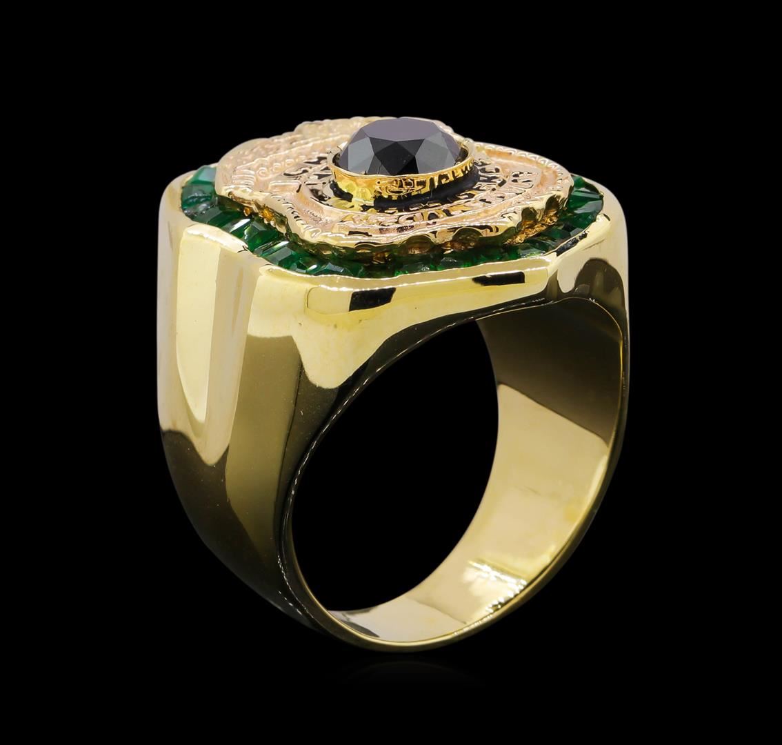 One electronically tested 14KT yellow gold gents cast & assembled black diamond and emerald ring. The ring features a black diamond set within a three dimensional badge/shield. An eagle with open wings sits atop of the badge/shield and Chief Internal Intelligence Special Service is written in black enamel around the back diamond. The badge/shield is set within an emerald bezel. The ring is supported by grooved tapering shoulders, completed by a six millimeter wide band. Bright polish finish. Identified with markings of "14K". Condition is good. Containing: One bezel set round brilliant cut diamond, measuring 6.60 - 6.50 x 5.21mm (depth est.), 6.00.%. GTCF approximate weight of 1.50ct. Indications of multiple laboratory enhancements. The specific gravity of black diamond is 3.120 to 3.165. Diamond tester results are non-reactive. Graded in the setting. Clarity Déclassé,. Color: Fancy Black; Irradiated. Thirty-two channel set square step cut natural emeralds, measuring 2.20 x 2.00 x 1.37mm, approximate total weight of 1.35ct., clarity is heavily included, type III, medium, moderately strong, very slightly bluish green color, (GIA vslbG 5/4), cut is good. Transmitting light somewhat diffusely, transparent to translucent. Naturally occurring internal & external characteristics are present. Measurements & the color grade are an average for the group. Indications of oil residue. Graded in the setting. Total Weight of Colored Stones 1.35ct. Total Weight of Diamonds 1.50ct. Total Weight of Ring 31.98gm. AIG Appraised at $7,995.00.