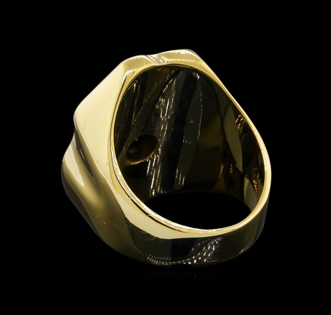One electronically tested 14KT yellow gold gents cast & assembled black diamond and emerald ring. The ring features a black diamond set within a three dimensional badge/shield. An eagle with open wings sits atop of the badge/shield and Chief Internal Intelligence Special Service is written in black enamel around the back diamond. The badge/shield is set within an emerald bezel. The ring is supported by grooved tapering shoulders, completed by a six millimeter wide band. Bright polish finish. Identified with markings of "14K". Condition is good. Containing: One bezel set round brilliant cut diamond, measuring 6.60 - 6.50 x 5.21mm (depth est.), 6.00.%. GTCF approximate weight of 1.50ct. Indications of multiple laboratory enhancements. The specific gravity of black diamond is 3.120 to 3.165. Diamond tester results are non-reactive. Graded in the setting. Clarity Déclassé,. Color: Fancy Black; Irradiated. Thirty-two channel set square step cut natural emeralds, measuring 2.20 x 2.00 x 1.37mm, approximate total weight of 1.35ct., clarity is heavily included, type III, medium, moderately strong, very slightly bluish green color, (GIA vslbG 5/4), cut is good. Transmitting light somewhat diffusely, transparent to translucent. Naturally occurring internal & external characteristics are present. Measurements & the color grade are an average for the group. Indications of oil residue. Graded in the setting. Total Weight of Colored Stones 1.35ct. Total Weight of Diamonds 1.50ct. Total Weight of Ring 31.98gm. AIG Appraised at $7,995.00.