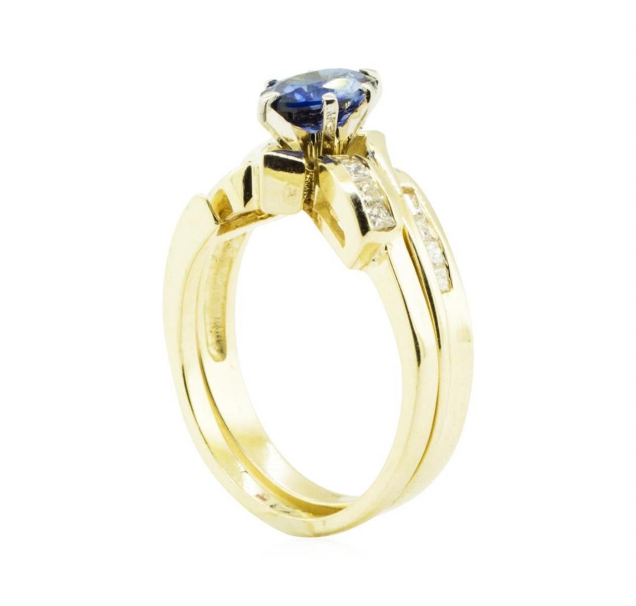One ring set featuring: 14KT yellow gold weighing 6.4 grams containing one oval blue sapphire weighing 1.05ct and channel set princess cut diamonds weighing 0.45ctw.