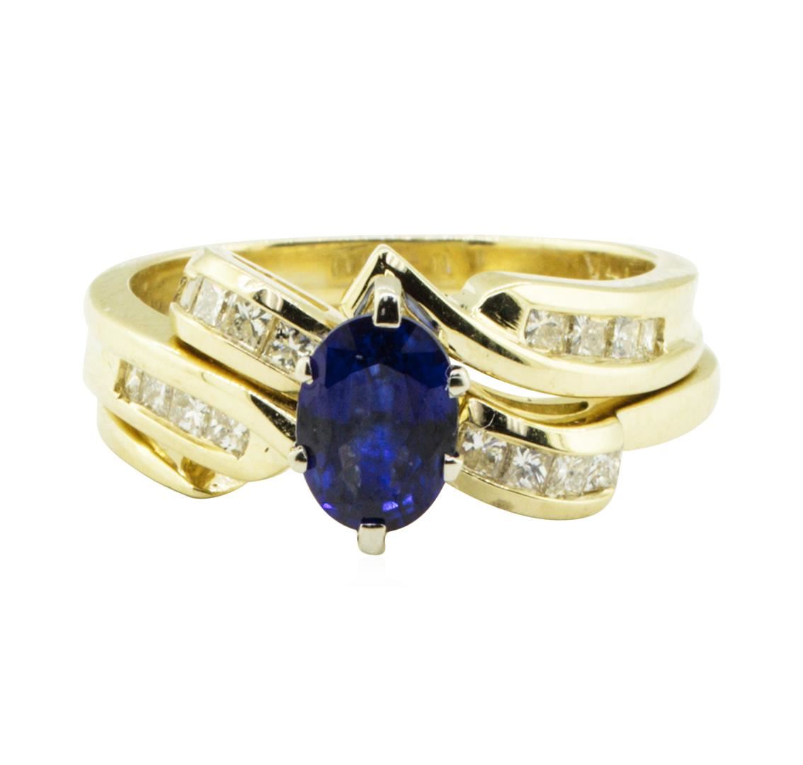 One ring set featuring: 14KT yellow gold weighing 6.4 grams containing one oval blue sapphire weighing 1.05ct and channel set princess cut diamonds weighing 0.45ctw.