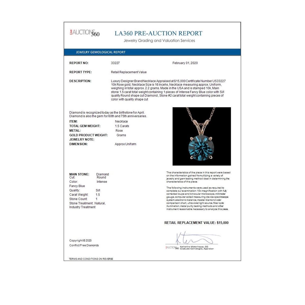 REF-153W4H - SKU: 33227 ---- 1.50 ctw Certified Intense Blue Diamond Necklace 10k Rose Gold