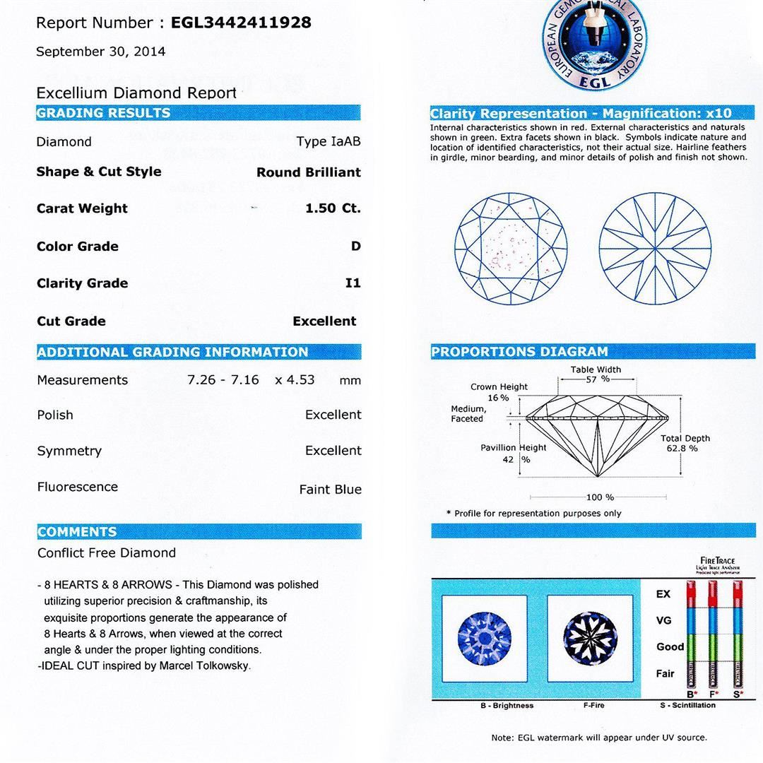 1.50ct D COLOR CENTER Diamond 18K White Gold Ring (2.22ctw Diamonds) EGL CERTIFIED. One polished, stamped and tested 18K white gold ring mounted with: 1 genuine diamond center stone weighing 1.50 carat, 6 genuine baguette diamonds weighing 0.22 carats and 50 genuine round diamonds weighing 0.50 carats. This item weighs 3.8 grams, condition is new, excellent workman-ship. MAIN GEMSTONE EGL Report No.: EGL3442411928 Identity: Natural Diamond Shape: Round Cutting Style: Brilliant Cut Measurements: 7.26 - 7.16 x 4.53 mm Weight: 1.50 carat Color Grade: D Clarity Grade: I1 Polish: Excellent Symmetry: Excellent Refractive Index: 2.417 Hardness: 10 ADJACENT GEMSTONES ON RING Identity: Natural Diamond Cut: Baguette / Round Brilliant Quantity: 56 Diamonds Measurements: 2.5 - 3.0 mm (6 baguette) 1.2 - 1.4 mm (50 round) Total Weight: 0.72 carats Color Grade: D - F Clarity Grade: SI1 - SI3 Refractive Index: 2.418 Hardness: 10 CENTER DIAMOND WEIGHT: 1.50ct TOTAL DIAMOND WEIGHT: 2.22ctw WEIGHT OF ITEM: 3.8 grams GOLD CONTENT: 18K White Gold