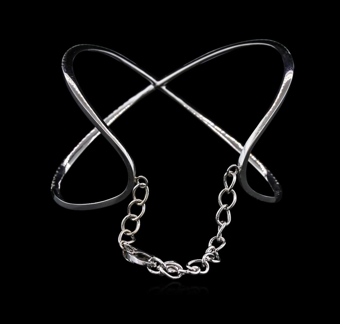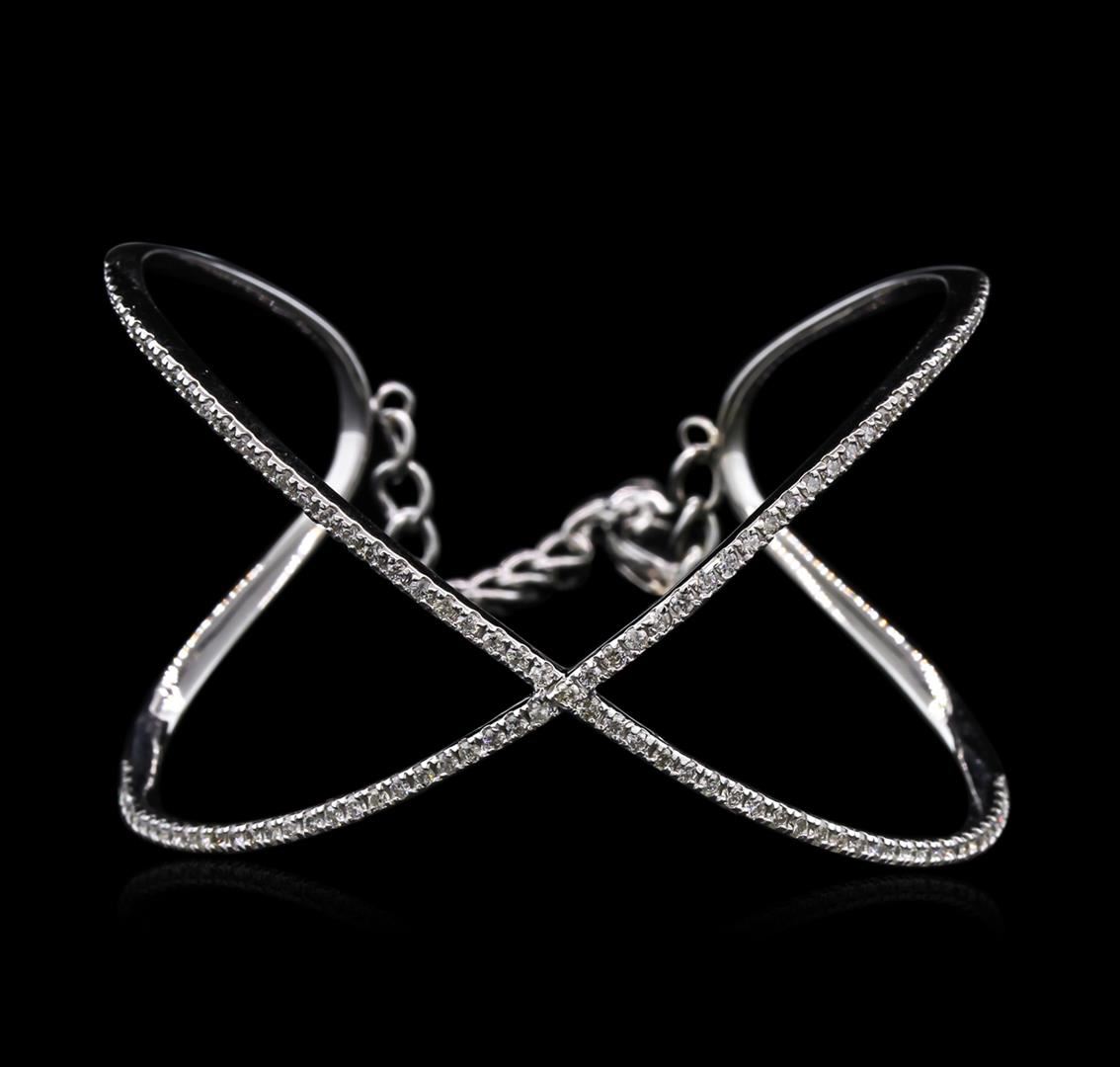 One electronically tested 14KT white gold lady's cast fashion bangle bracelet with a lobster claw clasp with a bright polish finish. The featured lady's bangle bracelet has a cross over motif with a cable link 2.5 inch in length safety chain. The bracelet measures 6.5 inches in length. Identified with markings of "K14". Condition is new, good workmanship. Containing: One Hundred Nine prong set round brilliant cut diamonds, measuring 1.50 - 1.45 x 0.97mm (depth est.) approximate total weight of 109 Stones = 1.50ct. Graded in the setting. Clarity: SI-2 to I-1. Color: I - Good. Total Weight of Diamonds 1.50ct. Total Weight of Bangle Bracelet 16.30gm. GAS Appraised at $6,130.00.