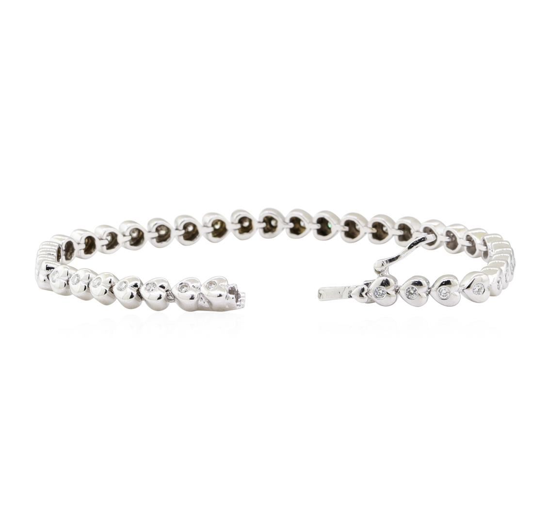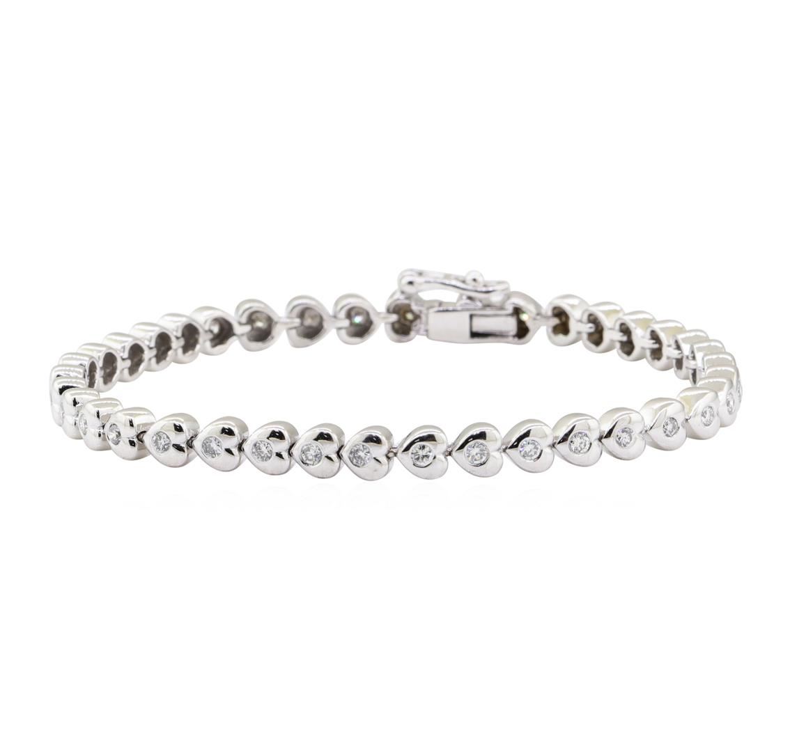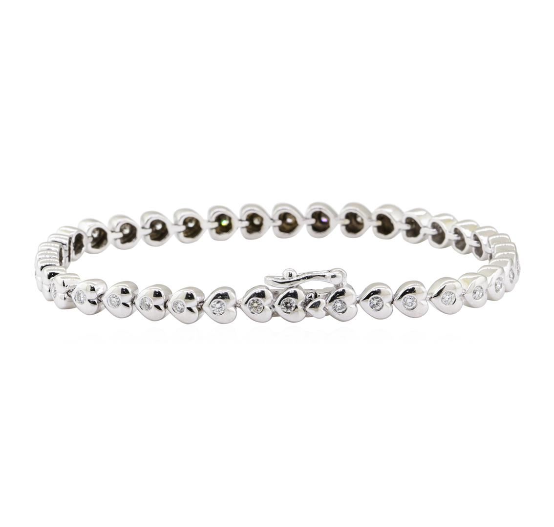 One electronically tested 14KT white gold lady's combination cast & assembled fashion heart shape motif bracelet with a tongue clasp & foldover safety with a straight line with a bright polish finish. The featured lady's bracelet measures approximately seven inches in length. Identified with markings of '14K'. Condition is new, good workmanship. Containing: Thirty-Eight bezel set round brilliant cut diamonds, measuring 2.20 - 2.15 x 1.35mm (depth est.) approximate total weight of 38 Stones = 1.50ct. Graded in the setting. Color H - I Clarity VS-2 to SI-1 Cut Very Good. Total Weight of Diamonds 1.50ct.. Total Weight of Bracelet 13.10gm GAS Appraised at $5960.00. GAS Appraised at $5,960.00.
