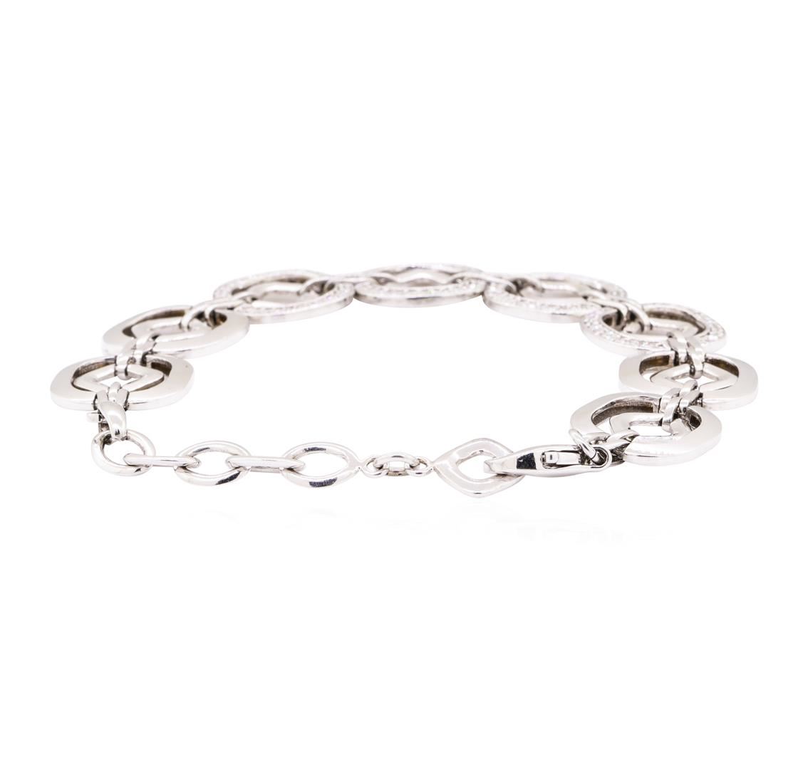 One electronically tested 18KT white gold lady's combination cast & assembled fashion bracelet with a lobster claw clasp with a bright polish finish. The featured lady's bracelet is adjustable and can be worn between seven and eight and a half inches in length. Identified with markings of '750'. Condition is new, good workmanship. Containing: Ninety-Six bead set round brilliant cut diamonds, measuring 1.60 - 1.55 x 0.98mm (depth est.) approximate total weight of 96 Stones = 1.50ct. Graded in the setting. Color H - I Clarity SI-2 to I-1 Cut Good. Total Weight of Diamonds 1.50ct.. Total Weight of Bracelet 28.10gm GAS Appraised at $8580.00. GAS Appraised at $8,580.00.