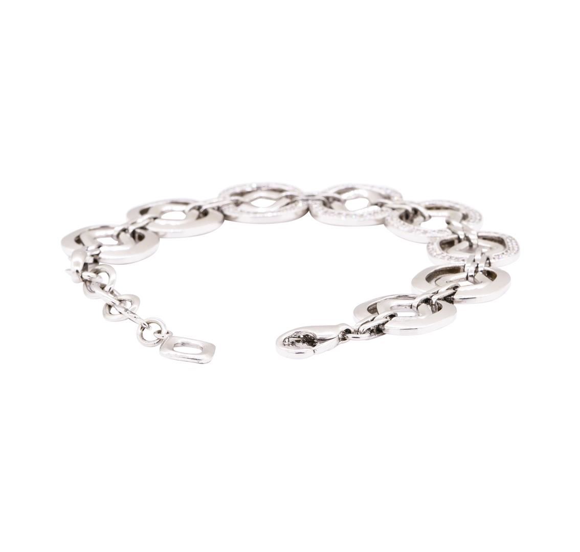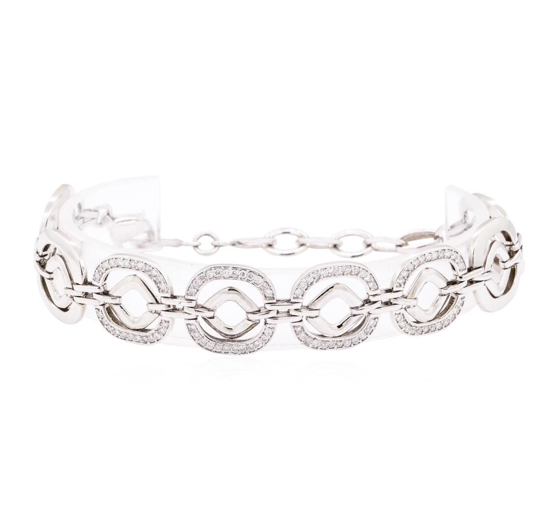 One electronically tested 18KT white gold lady's combination cast & assembled fashion bracelet with a lobster claw clasp with a bright polish finish. The featured lady's bracelet is adjustable and can be worn between seven and eight and a half inches in length. Identified with markings of '750'. Condition is new, good workmanship. Containing: Ninety-Six bead set round brilliant cut diamonds, measuring 1.60 - 1.55 x 0.98mm (depth est.) approximate total weight of 96 Stones = 1.50ct. Graded in the setting. Color H - I Clarity SI-2 to I-1 Cut Good. Total Weight of Diamonds 1.50ct.. Total Weight of Bracelet 28.10gm GAS Appraised at $8580.00. GAS Appraised at $8,580.00.
