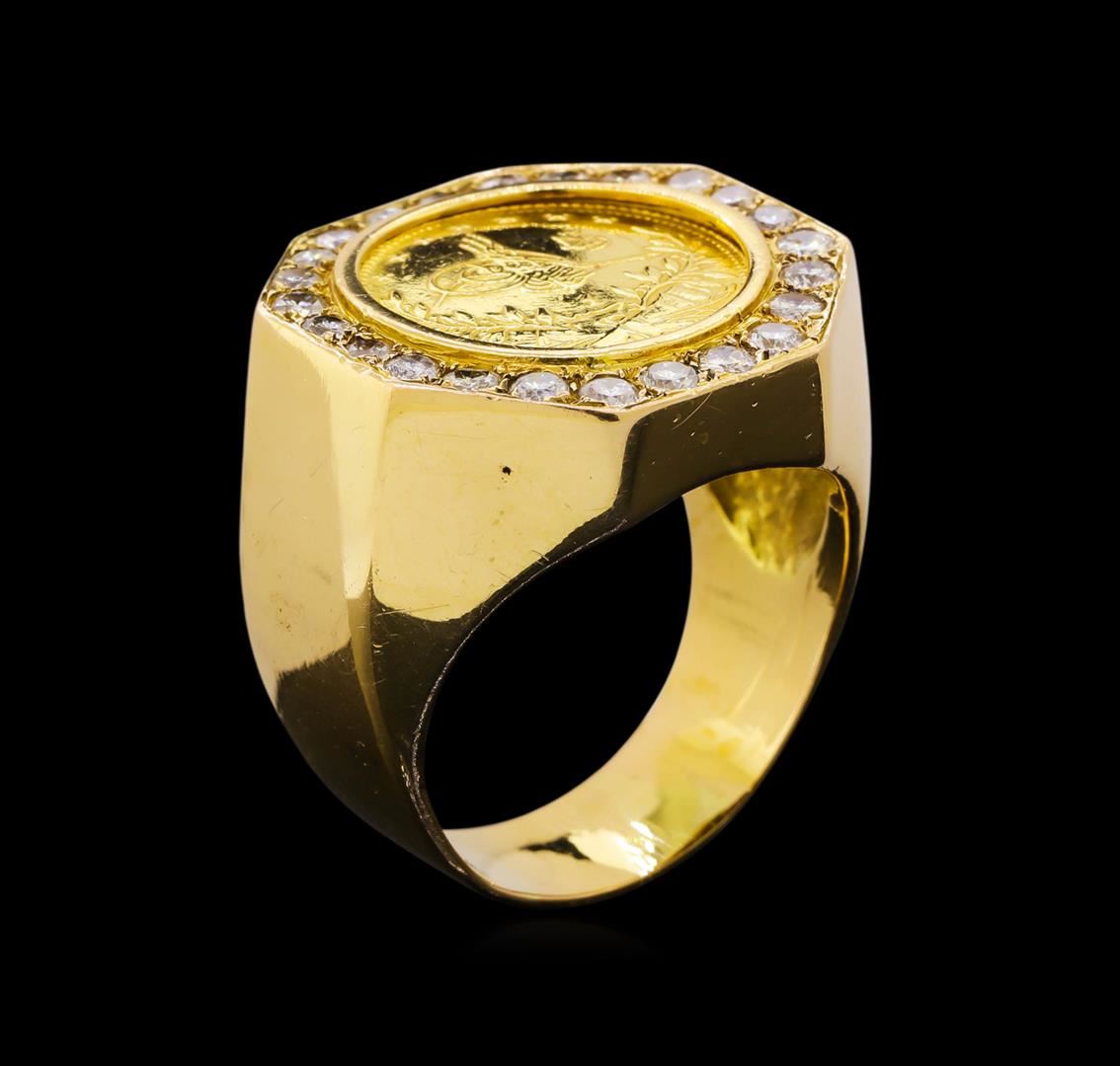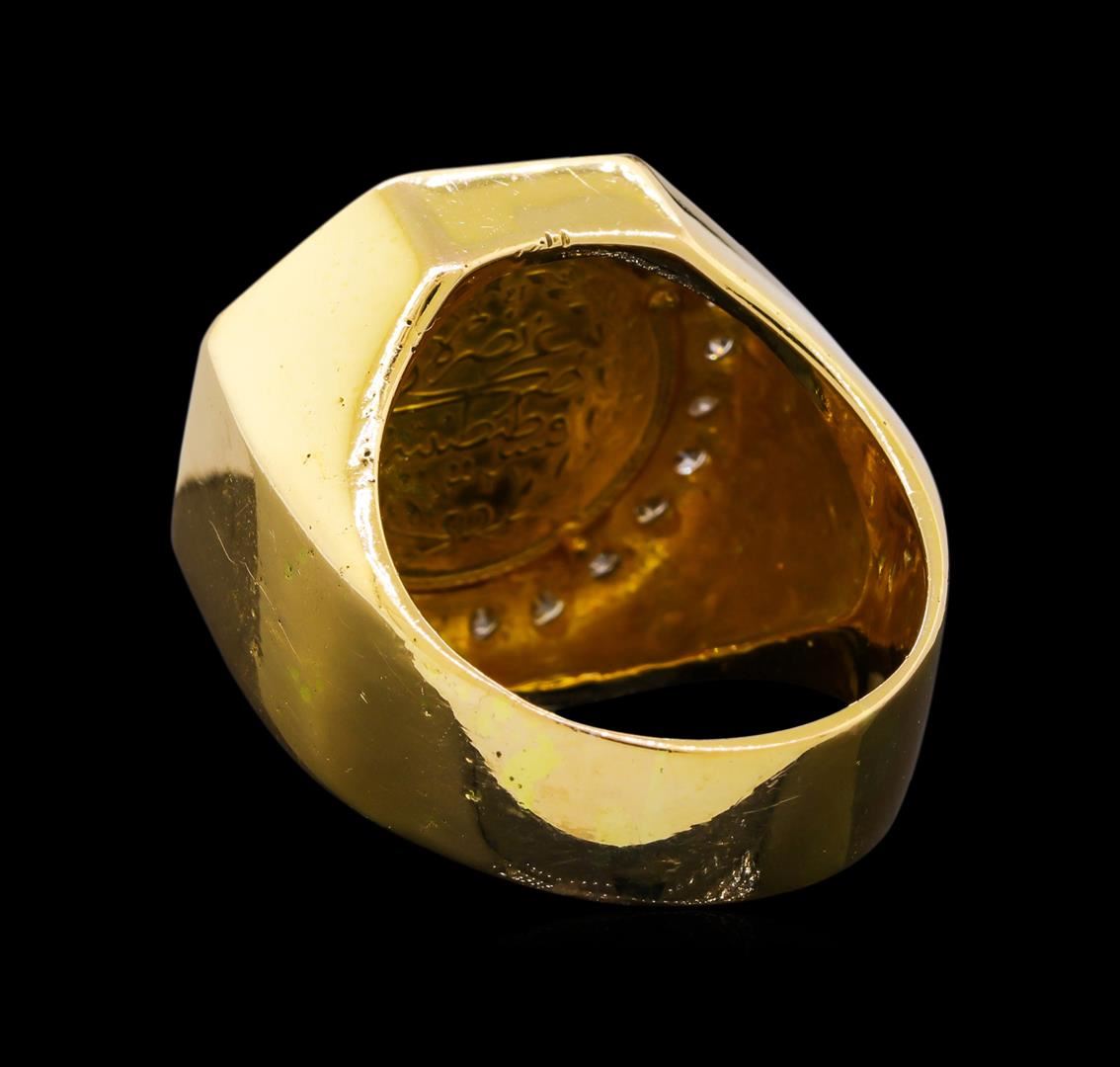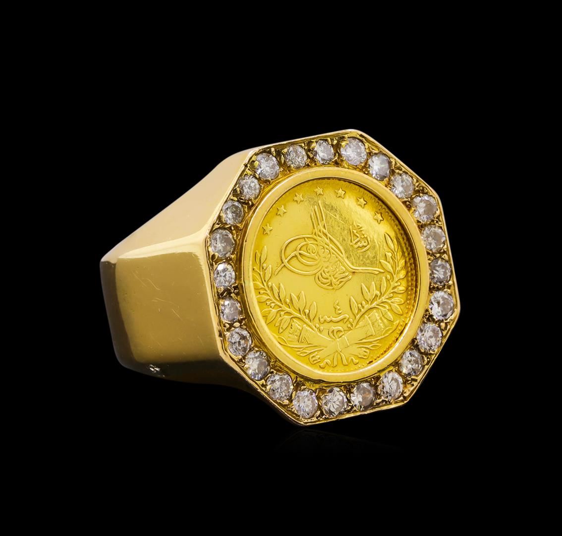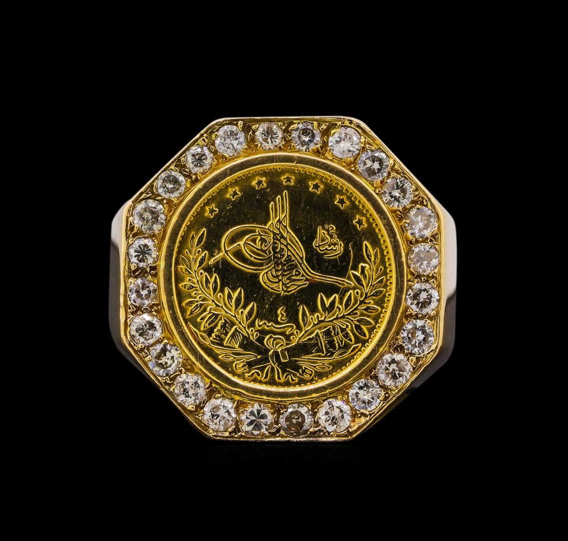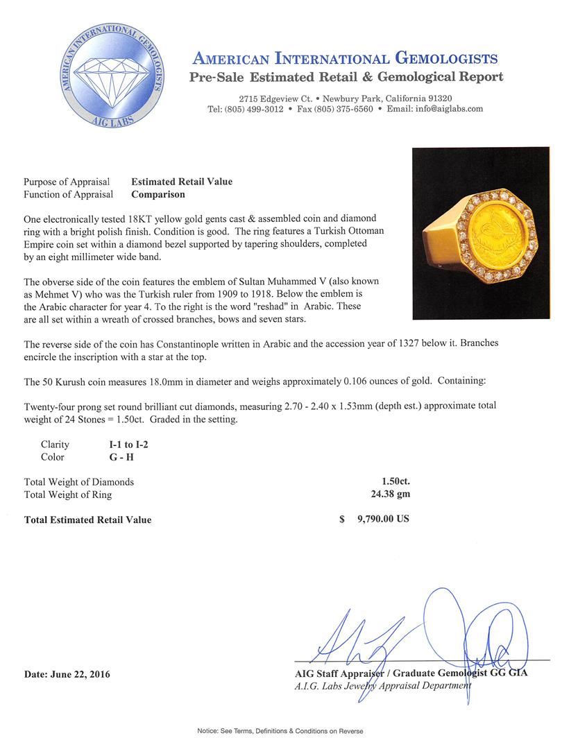 One electronically tested 18KT yellow gold gents cast & assembled coin and diamond ring with a bright polish finish. The ring features a Turkish Ottoman Empire coin set within a diamond bezel supported by tapering shoulders, completed by an eight millimeter wide band. The obverse side of the coin features the emblem of Sultan Muhammed V (also known as Mehmet V) who was the Turkish ruler from 1909 to 1918. Below the emblem is the Arabic character for year 4. To the right is the word "reshad" in Arabic. These are all set within a wreath of crossed branches, bows and seven stars. The reverse side of the coin has Constantinople written in Arabic and the accession year of 1327 below it. Branches encircle the inscription with a star at the top. The 50 Kurush coin measures 18.0mm in diameter and weighs approximately 0.106 ounces of gold. Condition is good. Containing: Twenty-Four prong set round brilliant cut diamonds, measuring 2.70 - 2.40 x 1.53mm (depth est.) approximate total weight of 24 Stones = 1.50ct. Graded in the setting. Clarity: I-1 to I-2 . Color: G - H. Total Weight of Diamonds 1.50ct.. Total Weight of Ring 24.38gm. AIG Appraised at $9,790.00.