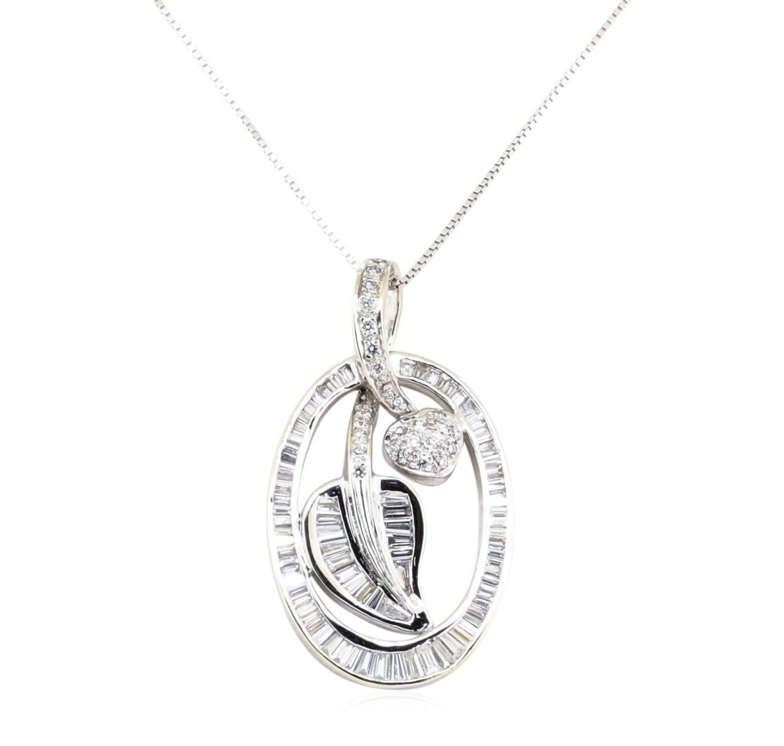 One oval floral motif pendant with chain featuring: 14KT white gold weighing 6.9 grams containing diamonds weighing 1.50ctw. The chain is a 0.7mm box link chain measuring sixteen inches in length.