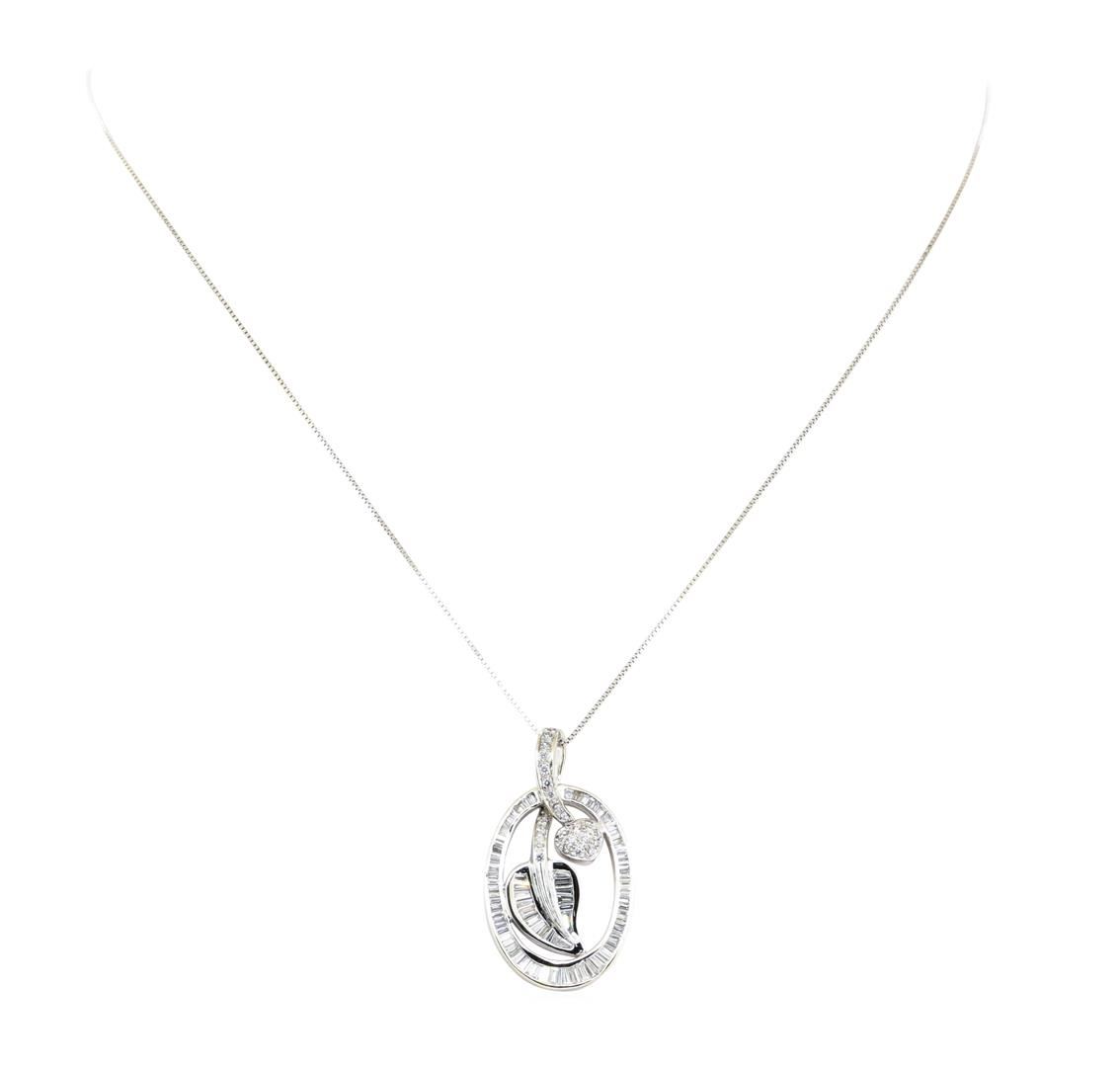 One oval floral motif pendant with chain featuring: 14KT white gold weighing 6.9 grams containing diamonds weighing 1.50ctw. The chain is a 0.7mm box link chain measuring sixteen inches in length.