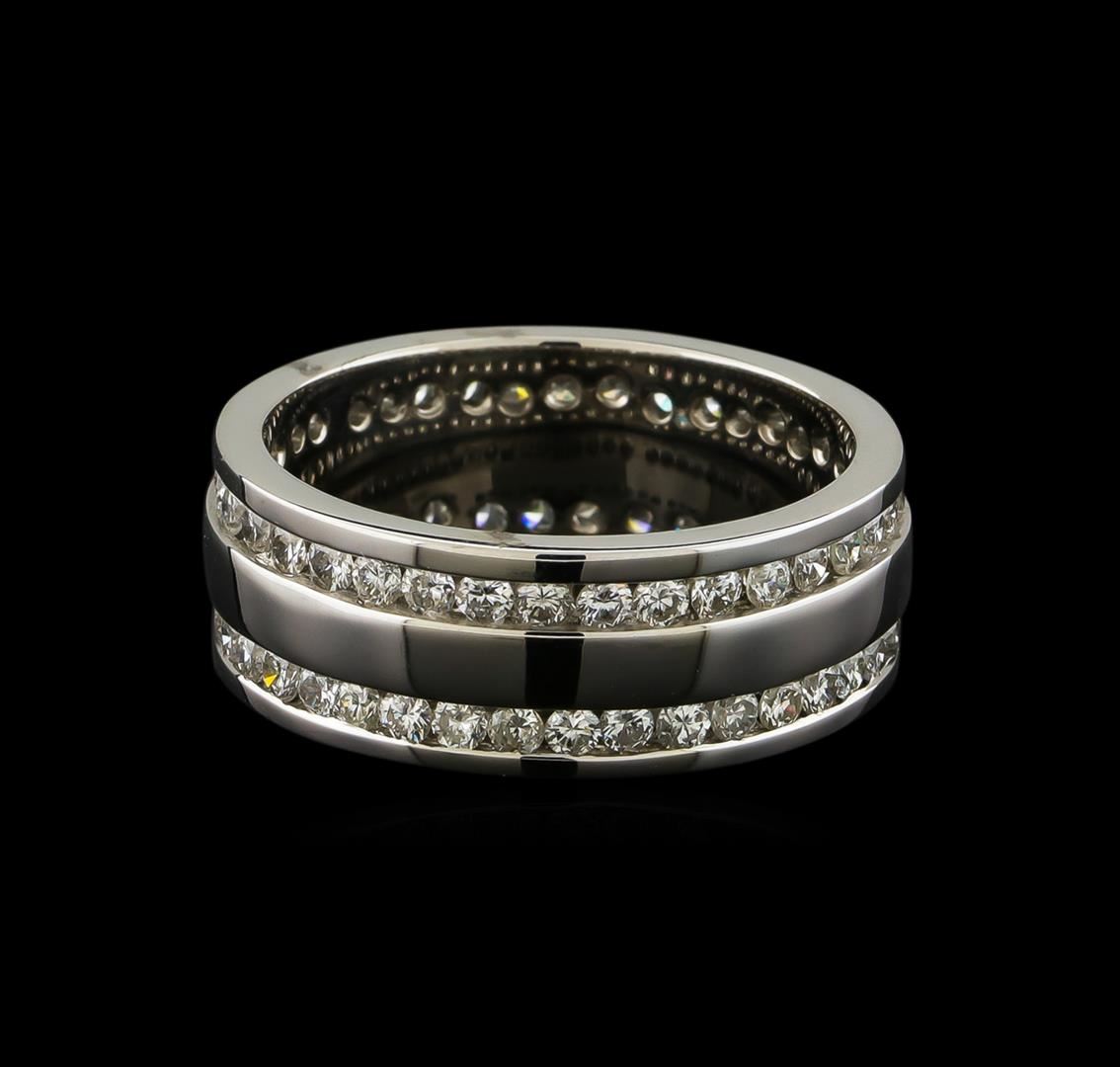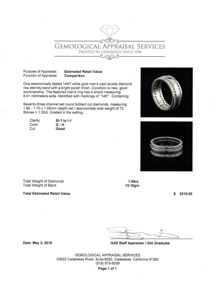 One electronically tested 14KT white gold man's cast double diamond row eternity band with a bright polish finish. The featured man's ring has a shank measuring 8.41 millimeters wide. Identified with markings of "14K". Condition is new, good workmanship. Containing: Seventy-Three channel set round brilliant cut diamonds, measuring 1.80 - 1.70 x 1.09mm (depth est.) approximate total weight of 73 Stones = 1.50ct. Graded in the setting. Clarity: SI-1 to I-1. Color: G - Good. Total Weight of Diamonds 1.50ct. Total Weight of Band 10.10gm GAS Appraised at $5,315.00.
