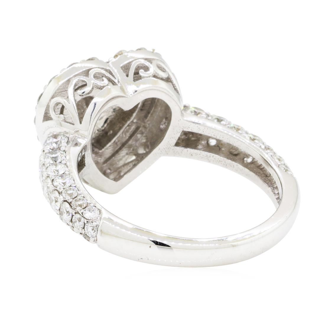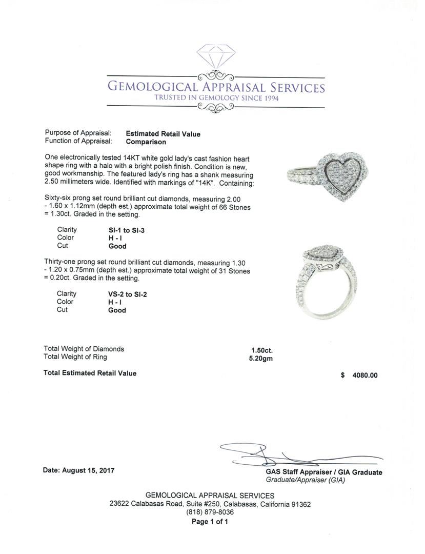 One electronically tested 14KT white gold lady's cast fashion heart shape ring with a halo with a bright polish finish. The featured lady's ring has a shank measuring 2.50 millimeters wide. Identified with markings of '14K'. Condition is new, good workmanship. Containing: Sixty-Six prong set round brilliant cut diamonds, measuring 2.00 - 1.60 x 1.12mm (depth est.) approximate total weight of 66 Stones = 1.30ct. Graded in the setting. Color H - I Clarity SI-1 to SI-3 Cut Good Thirty-One prong set round brilliant cut diamonds, measuring 1.30 - 1.20 x 0.75mm (depth est.) approximate total weight of 31 Stones = 0.20ct. Graded in the setting. Color H - I Clarity VS-2 to SI-2 Cut Good. Total Weight of Diamonds 1.50ct.. Total Weight of Ring 5.20gm GAS Appraised at $4080.00. GAS Appraised at $4,080.00.