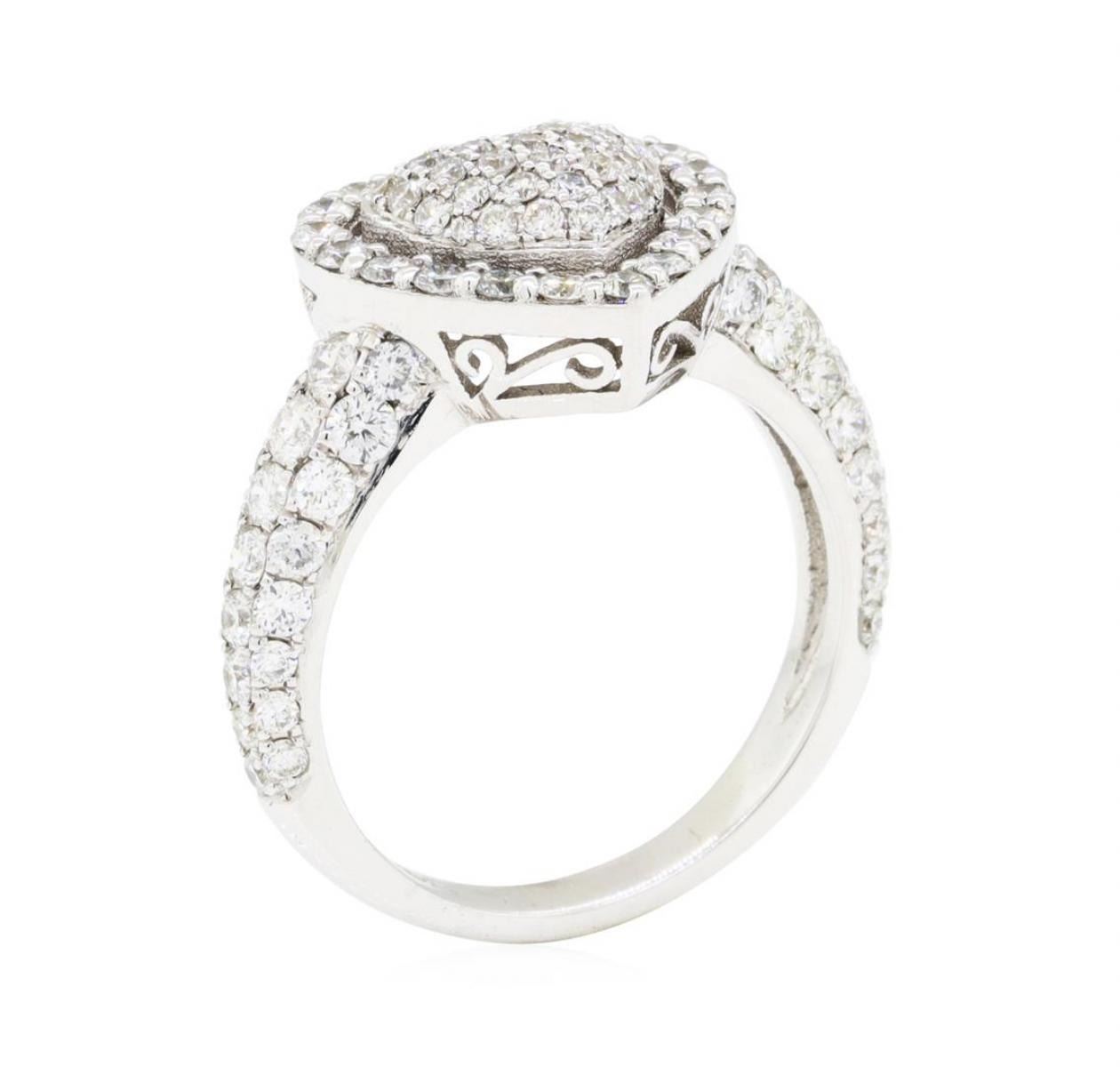 One electronically tested 14KT white gold lady's cast fashion heart shape ring with a halo with a bright polish finish. The featured lady's ring has a shank measuring 2.50 millimeters wide. Identified with markings of '14K'. Condition is new, good workmanship. Containing: Sixty-Six prong set round brilliant cut diamonds, measuring 2.00 - 1.60 x 1.12mm (depth est.) approximate total weight of 66 Stones = 1.30ct. Graded in the setting. Color H - I Clarity SI-1 to SI-3 Cut Good Thirty-One prong set round brilliant cut diamonds, measuring 1.30 - 1.20 x 0.75mm (depth est.) approximate total weight of 31 Stones = 0.20ct. Graded in the setting. Color H - I Clarity VS-2 to SI-2 Cut Good. Total Weight of Diamonds 1.50ct.. Total Weight of Ring 5.20gm GAS Appraised at $4080.00. GAS Appraised at $4,080.00.