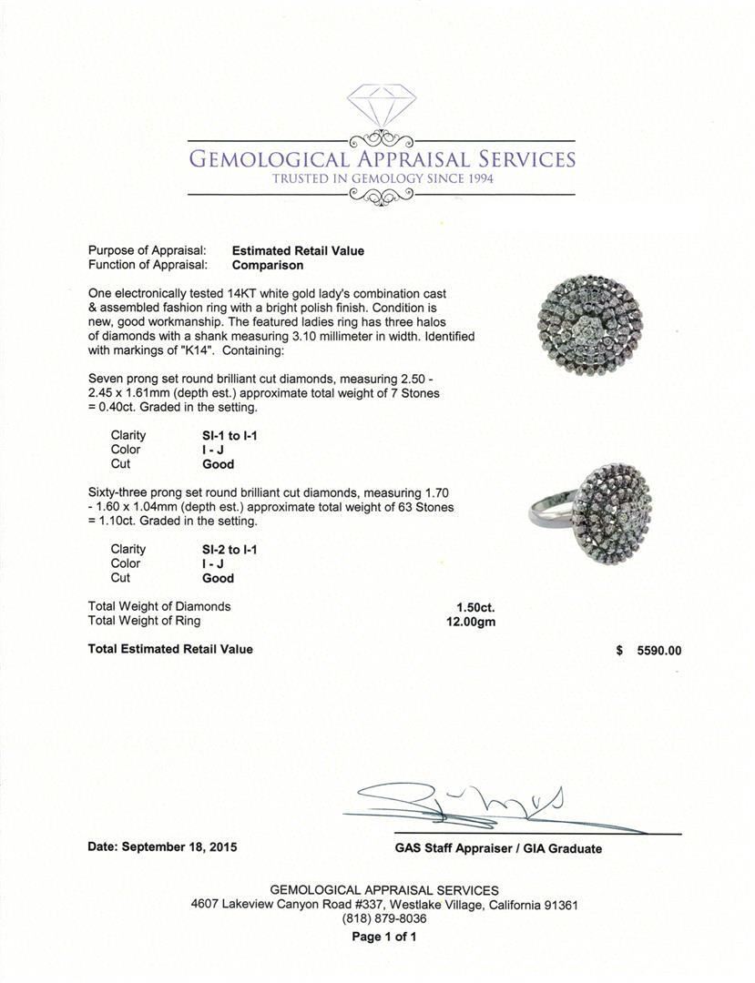 One electronically tested 14KT white gold lady's combination cast & assembled fashion ring with a bright polish finish. The featured ladies ring has three halos of diamonds with a shank measuring 3.10 millimeter in width. Identified with markings of "K14". Condition is new, good workmanship. Containing: Seven prong set round brilliant cut diamonds, measuring 2.50 - 2.45 x 1.61mm (depth est.) approximate total weight of 7 Stones = 0.40 ct. Graded in the setting. Clarity: SI-1 to I-1. Color: I - Good Sixty-Three prong set round brilliant cut diamonds, measuring 1.70 - 1.60 x 1.04mm (depth est.) approximate total weight of 63 Stones = 1.10 ct. Graded in the setting. Clarity: SI-2 to I-1. Color: I - Good. Total Weight of Diamonds 1.50 ct. Total Weight of Ring 12.00gm. GAS Appraised.
