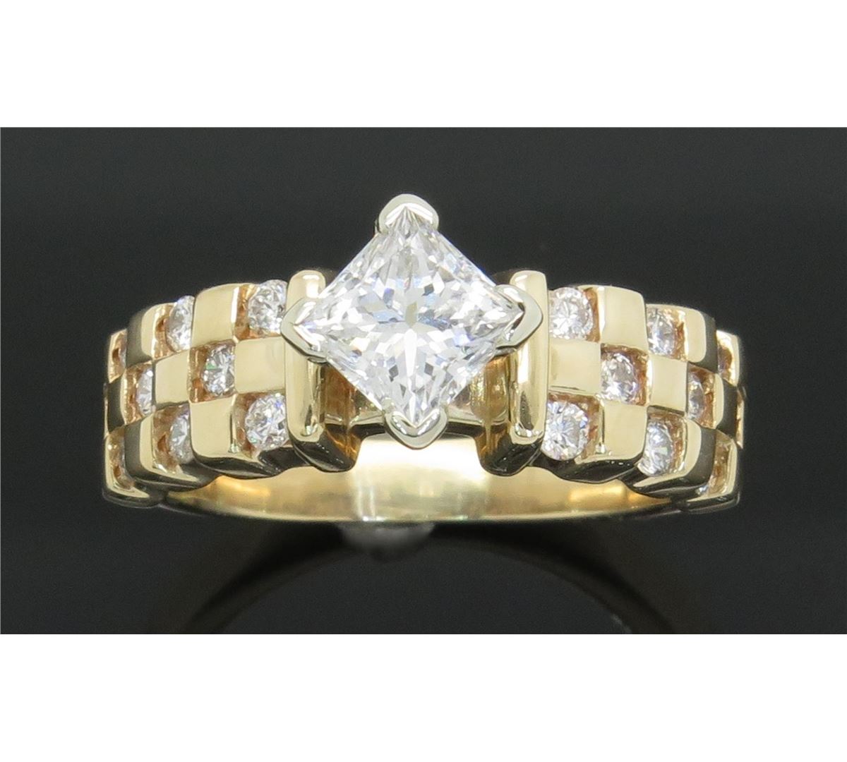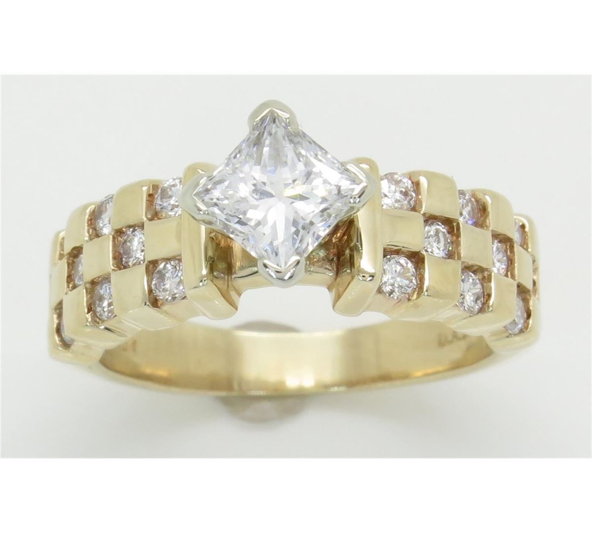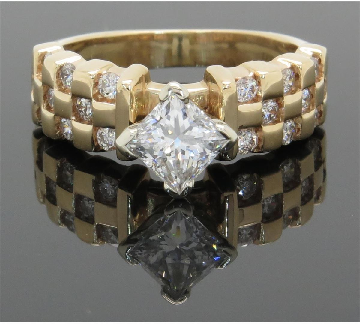 One tested 14K yellow gold diamond ring. Condition is new. Containing: 1 Princess Cut Diamond, Approximate weight: 1.00CT, Clarity: I1, Color: H-I. 18 Round Brilliant Cut Diamonds. Approximate total weight of all diamonds: 1.50CTW. All diamonds are graded in mounting unless otherwise stated. Weight of ring: 7.3 grams, Size: 7.5.