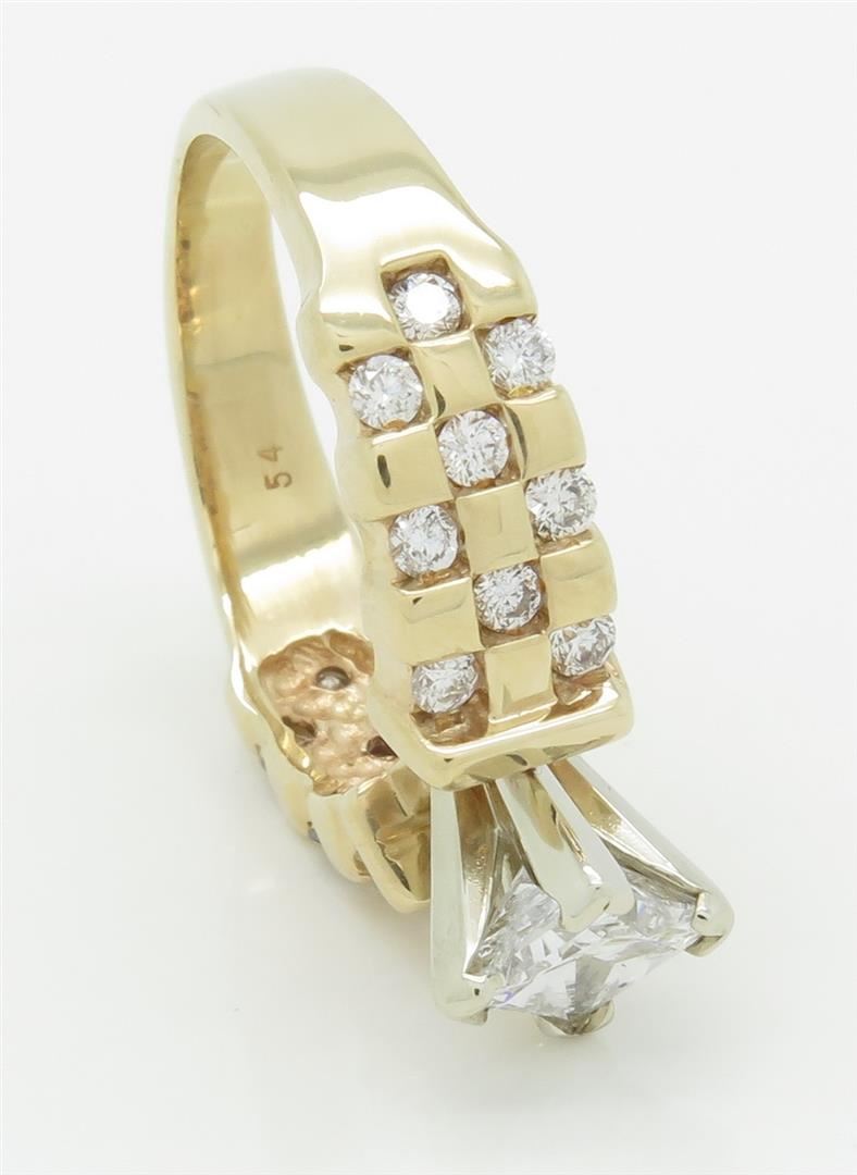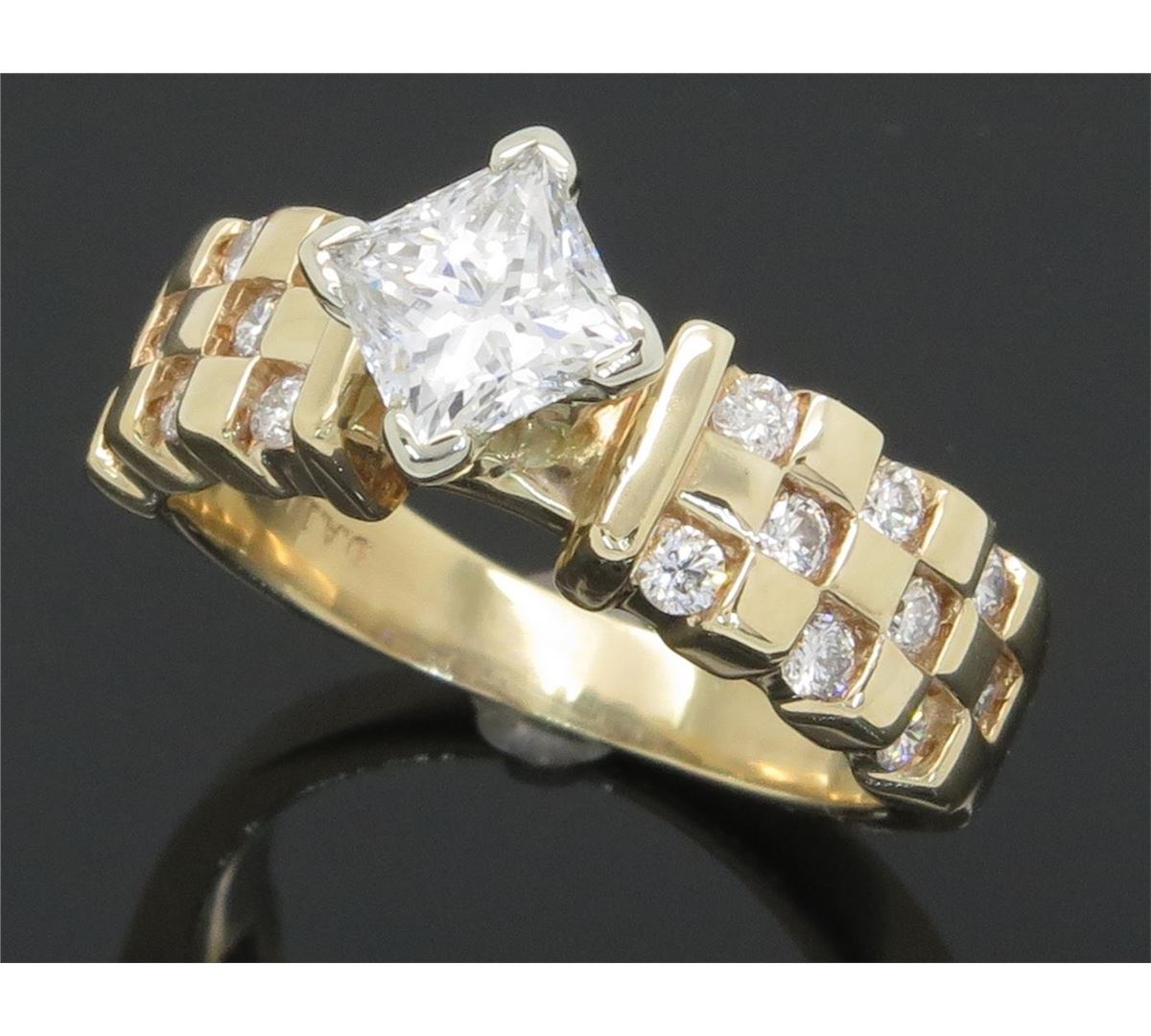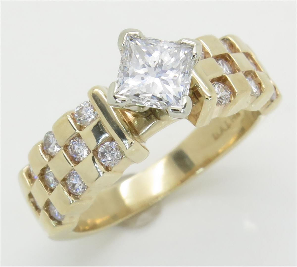 One tested 14K yellow gold diamond ring. Condition is new. Containing: 1 Princess Cut Diamond, Approximate weight: 1.00CT, Clarity: I1, Color: H-I. 18 Round Brilliant Cut Diamonds. Approximate total weight of all diamonds: 1.50CTW. All diamonds are graded in mounting unless otherwise stated. Weight of ring: 7.3 grams, Size: 7.5.