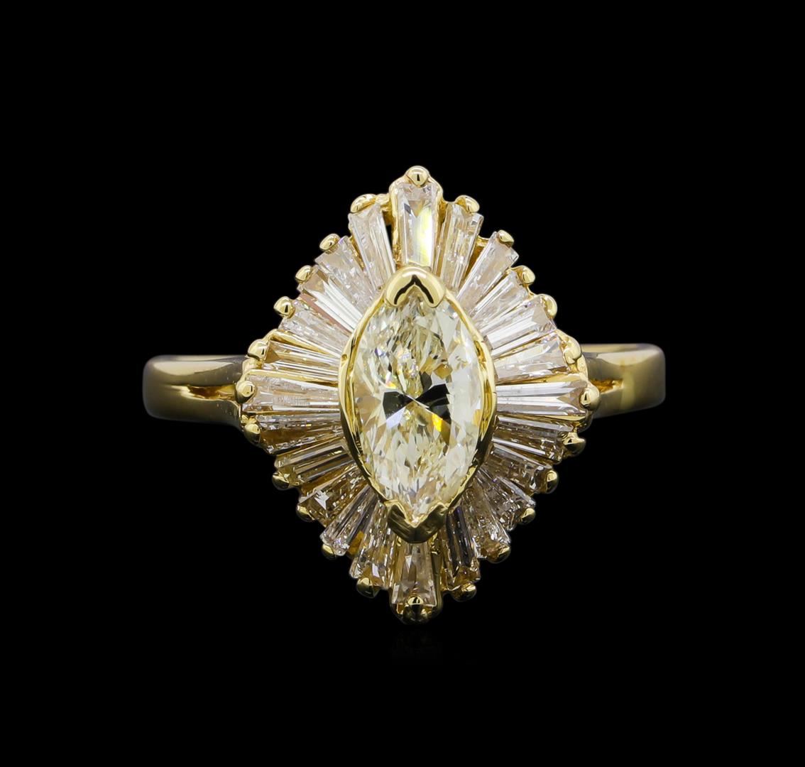 One electronically tested 14KT yellow gold ladies cast diamond ring with a bright polish finish. The ballerina style ring features a center marquise cut diamond set within a radiating diamond bezel supported by a ribbed under gallery and split shoulders, completed by a one and one-half millimeter wide bezel. Identified with markings of "14K". Condition is good. Containing: One prong set marquise shaped cut diamond, measuring 8.80 x 4.50 x 3.50mm (depth est.) approximate weight of 0.80ct with a strong blue fluorescence. Naturally occurring internal & external characteristics are present, including surface reaching features and cavities. Graded in the setting. Clarity: SI-2. Color: K. Depth 77.8%. Table 57.8%. Twenty-Four prong set baguette cut (tapered) diamonds, measuring from 3.20 x 1.00 x 0.70mm (depth est.) to 3.70 x 1.30 x 0.91mm (depth est.) approximate total weight of 24 Stones = 0.70ct. The clarity grade reflects the entire range of clarity for this group. Graded in the setting. Clarity: VS-2 to I-1. Color: G - I. Total Weight of Diamonds 1.50ct. Total Weight of Ring 4.17gm. AIG Appraised at $7,105.00.
