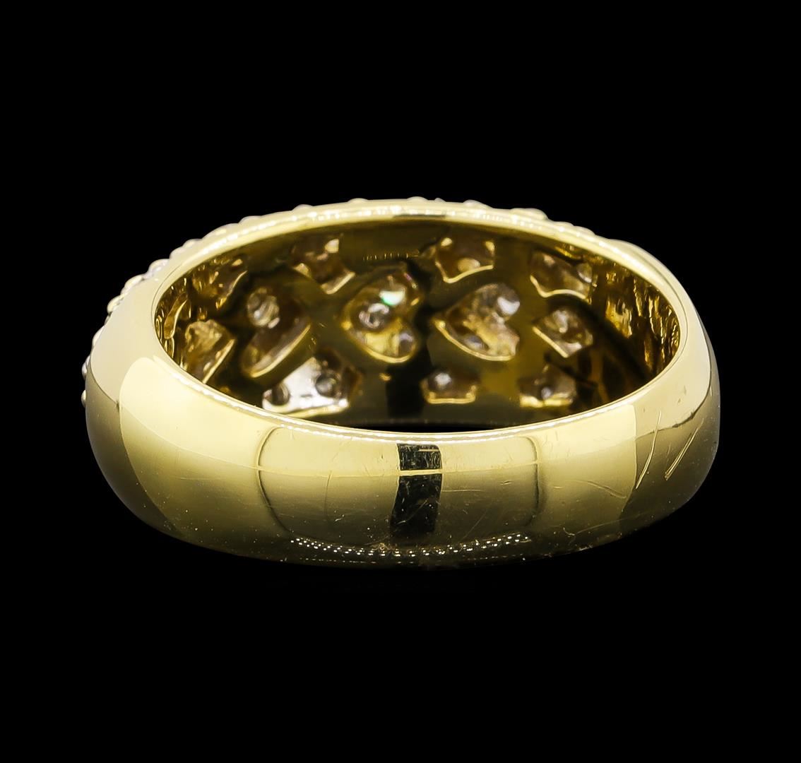 One electronically tested 14KT yellow gold lady's cast fashion ring with a five row half dome with a bright polish finish. The featured lady's ring has a shank measuring 4.70 millimeters wide. Identified with markings of '14K'. Condition is new, good workmanship. Containing: Thirteen prong set round brilliant cut diamonds, measuring 2.30 - 2.25 x 1.39mm (depth est.) approximate total weight of 13 Stones = 0.57ct. Graded in the setting. Clarity SI-1 to SI-2. Color: H - I Cut Good Twenty-Four prong set round brilliant cut diamonds, measuring 2.00 - 1.90 x 1.21mm (depth est.) approximate total weight of 24 Stones = 0.68ct. Graded in the setting. Clarity SI-1 to SI-2. Color: H - I Cut Good Twenty-Two prong set round brilliant cut diamonds, measuring 1.50 - 1.40 x 0.90mm (depth est.) approximate total weight of 22 Stones = 0.25ct. Graded in the setting. Clarity SI-1 to SI-2. Color: H - I Cut Good. Total Weight of Diamonds 1.50ct.. Total Weight of Ring 6.50gm. GAS Appraised at $2,667.00.