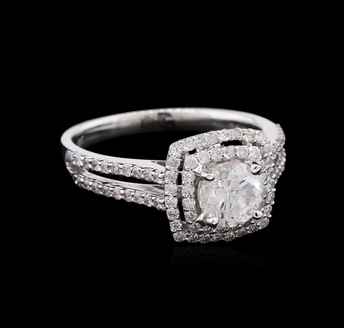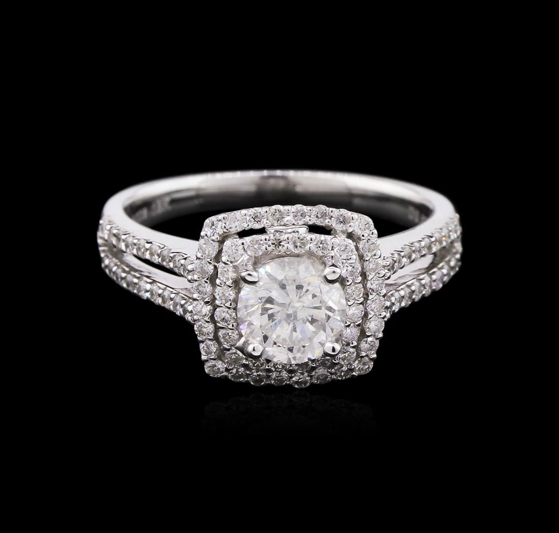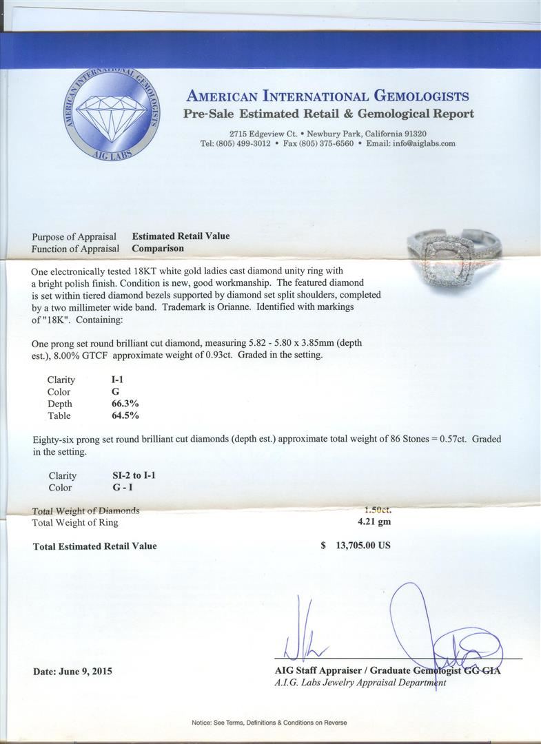One electronically tested 18KT white gold ladies cast diamond unity ring with a bright polish finish. The featured diamond is set within tiered diamond bezels supported by diamond set split shoulders, completed by a two millimeter wide band. Trademark is Orianne. Identified with markings of "18K". Condition is new, good workmanship. Containing: One prong set round brilliant cut diamond, measuring 5.82 - 5.80 x 3.85mm (depth est.), 8.00.%. GTCF approximate weight of 0.93ct. Graded in the setting. Clarity: I-1. Color: 66.3%. Table 64.5%. Eighty-Six prong set round brilliant cut diamonds (depth est.) approximate total weight of 86 Stones = 0.57ct. Graded in the setting. Clarity: SI-2 to I-1. Color: G - I. Total Weight of Diamonds 1.50ct. AIG Appraised at $13,705.00.
