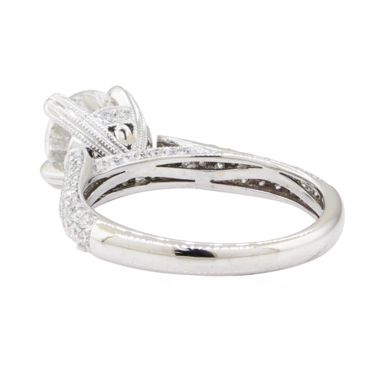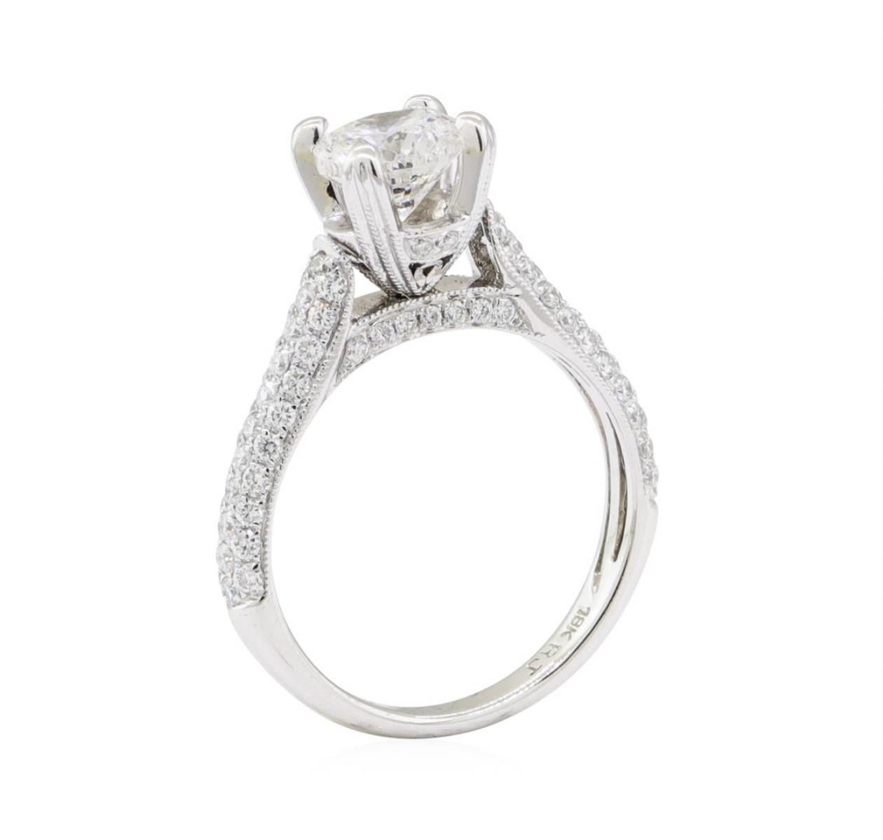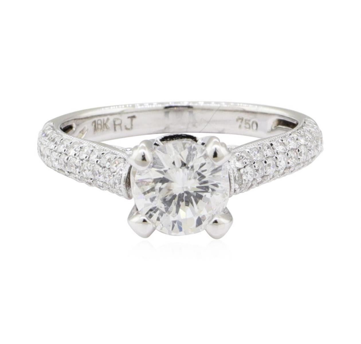 One electronically tested 18KT white gold lady's combination cast & assembled wedding ring with a straight line cathedral shank with a bright polish with milgrain detailing finish. The featured lady's ring has a shank measuring 2.15 millimeters wide. Trademark is RJ. Identified with markings of '18K 750'. Condition is new, good workmanship. Containing: One prong set round brilliant cut diamond, measuring 6.17 - 6.15 x 4.10mm (depth est.) , 5.00.%. GTCF approximate weight of 1.00ct. Graded in the setting. Color G Clarity SI-3 Cut Good Seventy-Eight prong set round brilliant cut diamonds, measuring 1.20 - 1.15 x 0.73mm (depth est.) approximate total weight of 78 Stones = 0.50ct. Graded in the setting. Color G - H Clarity VS-2 to SI-1 Cut Very Good. Total Weight of Diamonds 1.50ct.. Total Weight of Ring 3.00gm GAS Appraised at $11965.00. GAS Appraised.