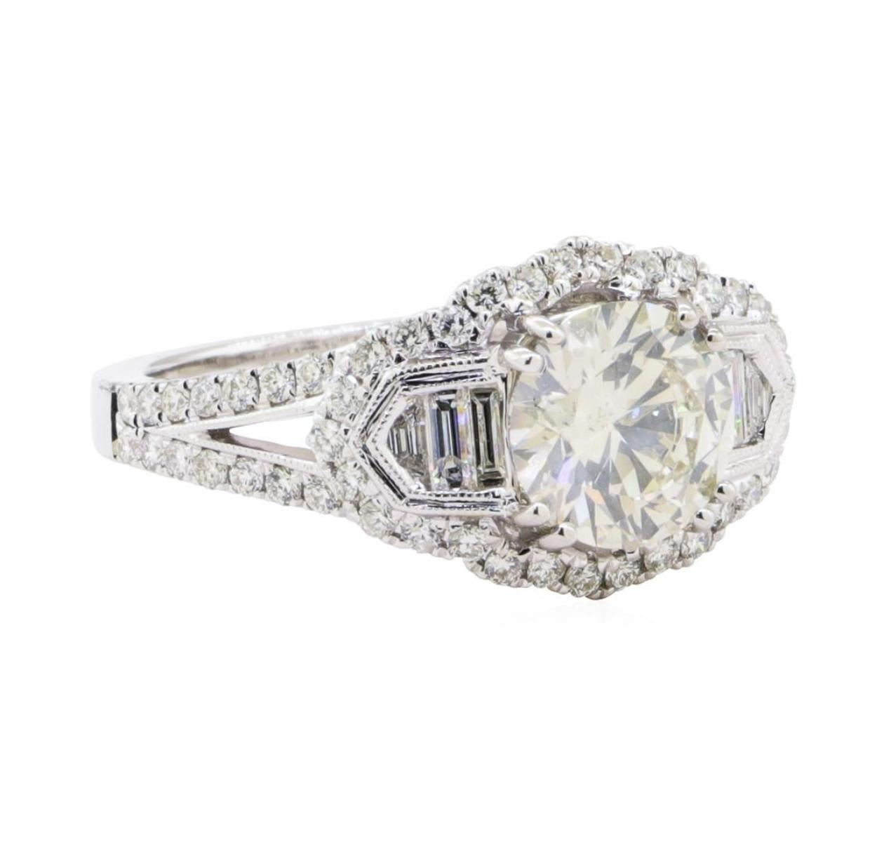 One stamped & electronically tested 18KT white gold ladies cast diamond ring. The featured diamond is set within a floral design diamond bezel, supported by an elaborate lattice under gallery and diamond set shoulders, completed by a two millimeter wide band. Bright polish finish with milgrain detailing throughout. Trademark is UCG. Identified with markings of "18K 750". Condition is new, good workmanship. Containing: One prong set round brilliant cut diamond, measuring 7.54 - 7.48 x 4.38mm exact weight 1.50ct. Graded loose prior to setting in the EGL Laboratory, Report #US917731015D. The EGL Report is attached. Clarity SI-2 Color J Six channel set baguette cut diamonds, measuring from 3.00 x 1.50 x 1.28mm (depth est.) to 3.50 x 1.20 x 1.02mm (depth est.) approximate total weight of 6 Stones = 0.20ct. Graded in the setting. Clarity SI-1 to I-1 Color F - H Fifty-Eight bead set round brilliant cut diamonds, measuring 1.30 - 1.30 x 0.78mm (depth est.) approximate total weight of 58 Stones = 0.47ct. Graded in the setting. Clarity SI-1 to I-1 Color F - H Total Weight of Diamonds 2.17 ct. Total Weight of Ring 4.97 gm Estimated Retail Value $ 30,900.00 US
