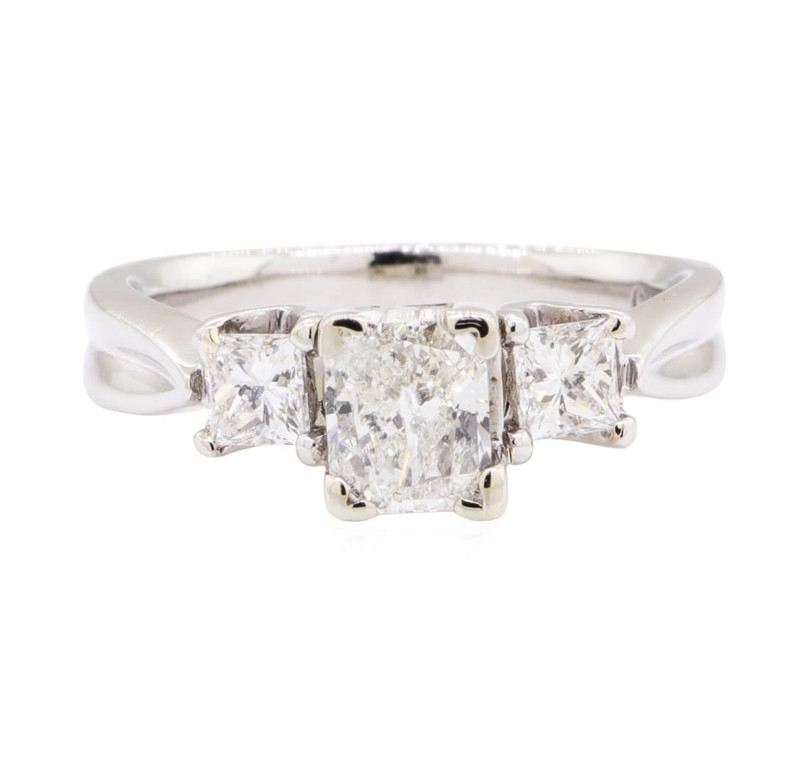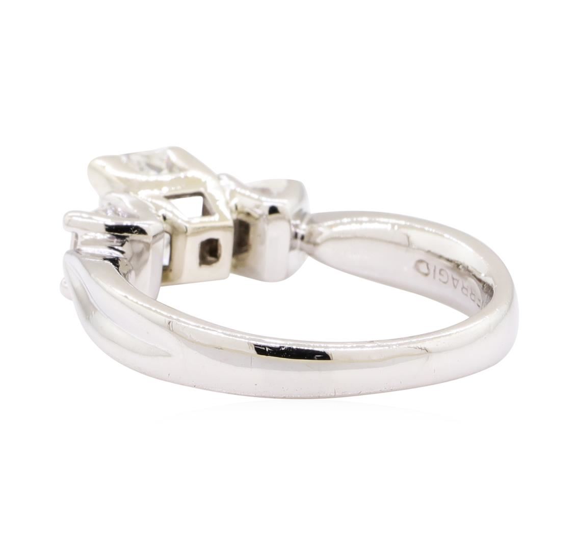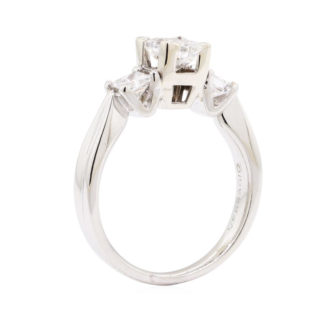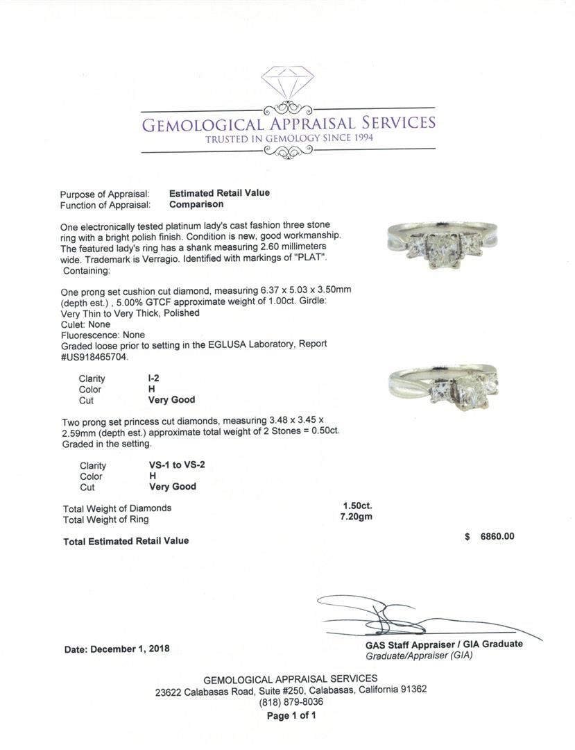 One electronically tested platinum lady's cast fashion three stone ring with a bright polish finish. The featured lady's ring has a shank measuring 2.60 millimeters wide. Trademark is Verragio. Identified with markings of 'PLAT'. Condition is new, good workmanship. Containing: One prong set cushion cut diamond, measuring 6.37 x 5.03 x 3.50mm (depth est.) , 5.00.%. GTCF approximate weight of 1.00ct. Girdle: Very Thin to Very Thick, PolishedCulet: NoneFluorescence: NoneGraded loose prior to setting in the EGLUSA Laboratory, Report #US918465704. Color H Clarity I-2 Cut Very Good Two prong set princess cut diamonds, measuring 3.48 x 3.45 x 2.59mm (depth est.) approximate total weight of 2 Stones = 0.50ct. Graded in the setting. Color H Clarity VS-1 to VS-2 Cut Very Good. Total Weight of Diamonds 1.50ct.. Total Weight of Ring 7.20gm GAS Appraised at $6860.00. GAS Appraised at $6,860.00.