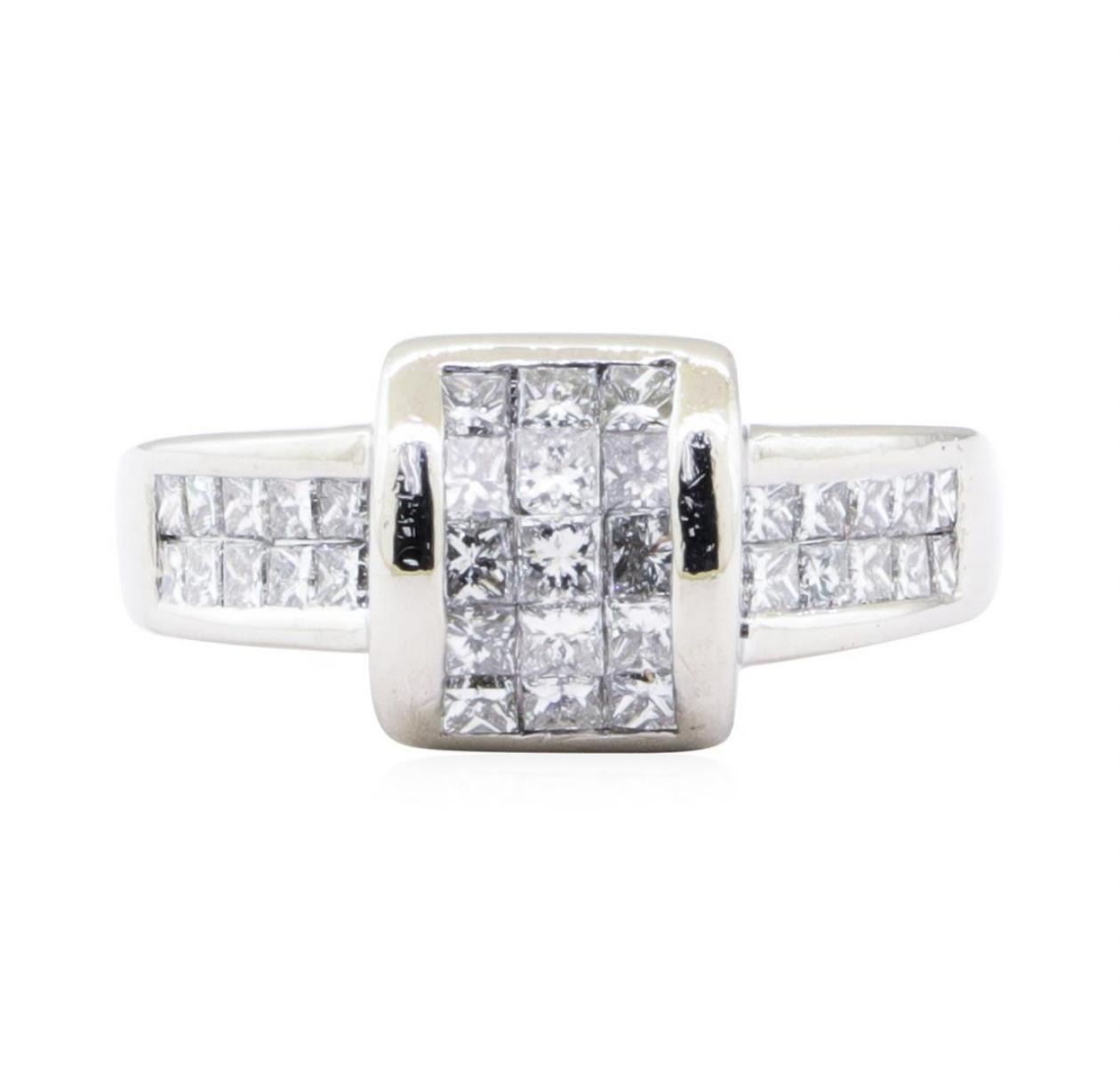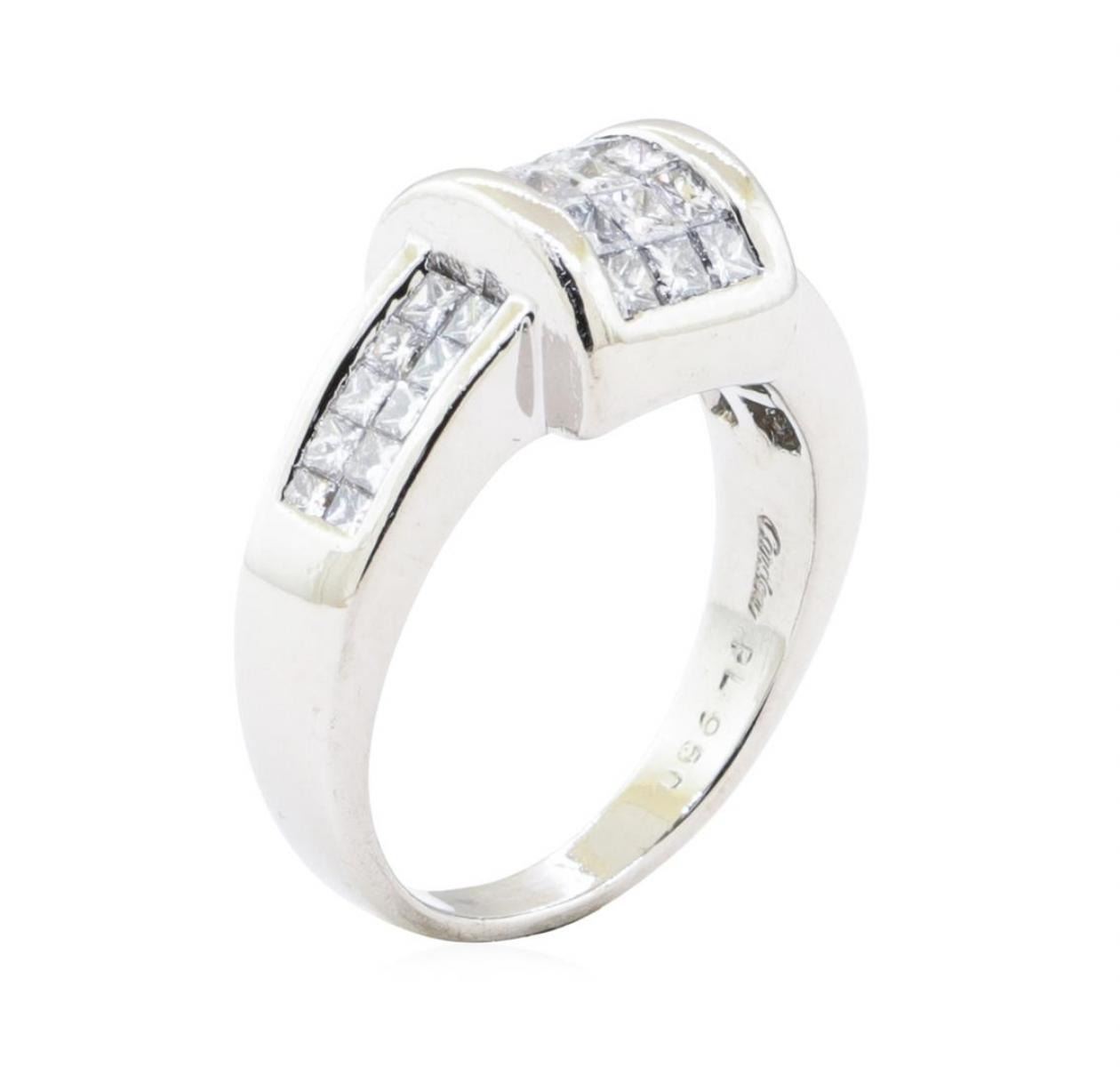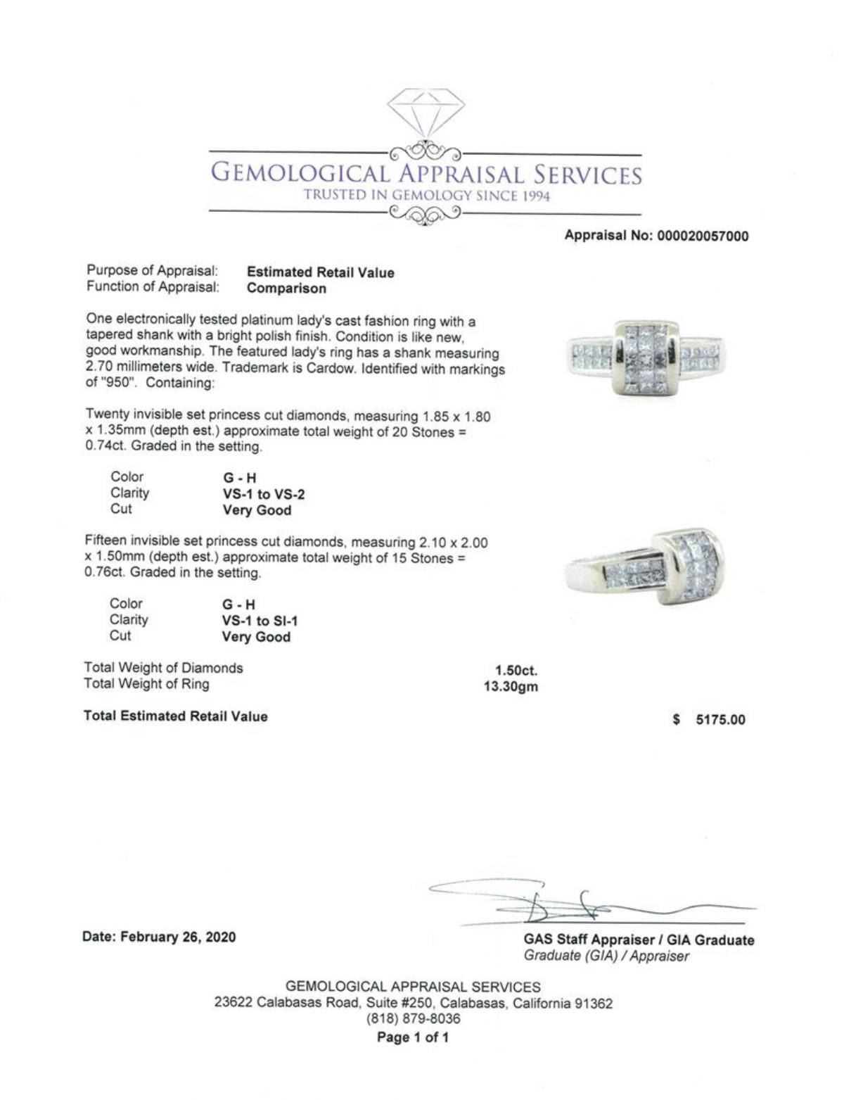 One electronically tested platinum lady's cast fashion ring with a tapered shank with a bright polish finish. The featured lady's ring has a shank measuring 2.70 millimeters wide. Trademark is Cardow. Identified with markings of '950'. Condition is Good. Containing: Twenty invisible set princess cut diamonds, measuring 1.85 x 1.80 x 1.35mm (depth est.) approximate total weight of 20 Stones = 0.74ct. Graded in the setting. Color G - H Clarity VS-1 to VS-2 Cut Very Good Fifteen invisible set princess cut diamonds, measuring 2.10 x 2.00 x 1.50mm (depth est.) approximate total weight of 15 Stones = 0.76ct. Graded in the setting. Color G - H Clarity VS-1 to SI-1 Cut Very Good. Total Weight of Diamonds 1.50ct.. Total Weight of Ring 13.30gm GAS Appraised at $5175.00. GAS Appraised.
