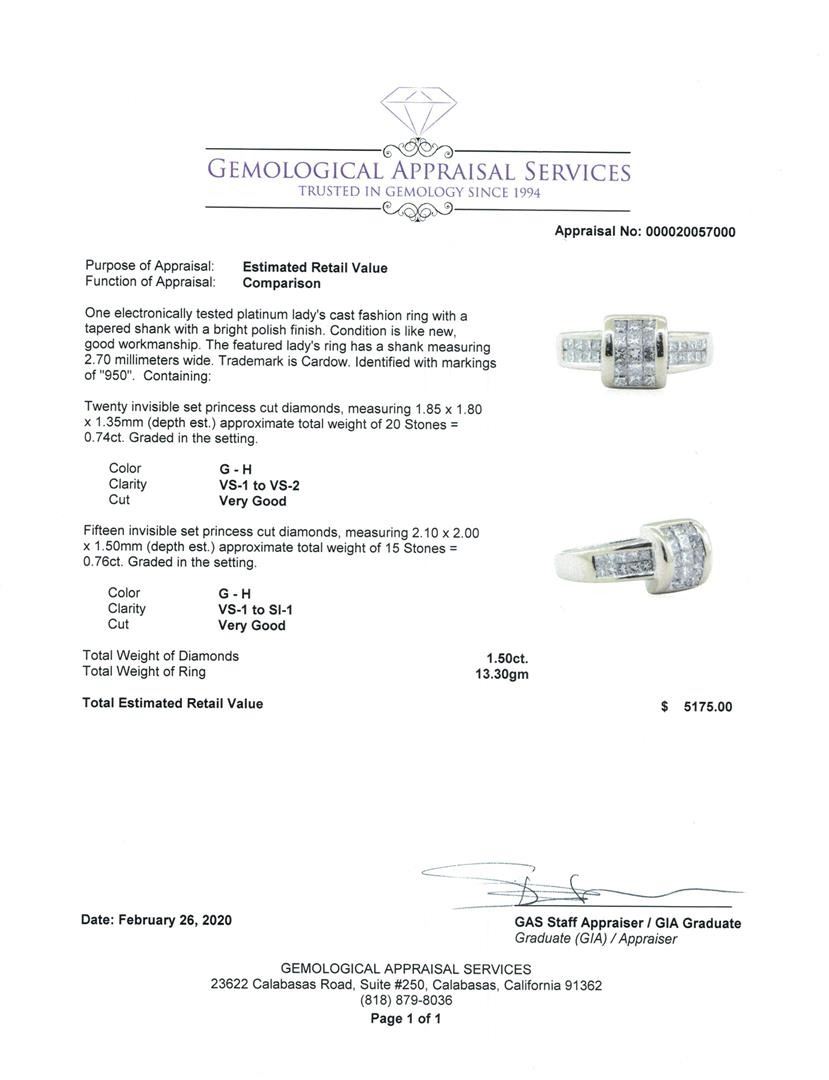 One electronically tested platinum lady's cast fashion ring with a tapered shank with a bright polish finish. The featured lady's ring has a shank measuring 2.70 millimeters wide. Trademark is Cardow. Identified with markings of '950'. Condition is Good.