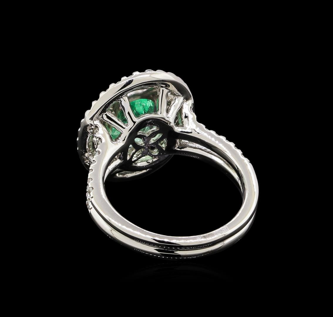 One electronically tested 14KT white gold lady's cast fashion ring with a split shank double basket halo with a bright polish finish. The featured lady's ring has a double shank measuring 3.15 millimeters wide. Identified with markings of '14K'. Condition is new, good workmanship. Containing: One prong set oval modified brilliant cut natural emerald, measuring 9.35 x 6.51 x 4.23mm, (depth est.) approximate weight of 1.50ct., clarity is slightly included, medium, moderately strong, green color, (GIA G 5/4), cut is good. Transmitting light with a minimum of distortion, transparent. Naturally occurring internal & external characteristics are present. Indications of oil residue. Colored gemstones are presumed to have been subjected to commonly used enhancement processes. Graded in the setting. Eighty-Two prong set round brilliant cut diamonds, measuring 1.30 - 1.20 x 0.78mm (depth est.) approximate total weight of 82 Stones = 0.62ct. Graded in the setting. Clarity SI-1 to I-1. Color: G - I Cut Good. Total Weight of Colored Stones 1.50ct.. Total Weight of Diamonds 0.62ct.. Total Weight of Ring 6.90gm. GAS Appraised.