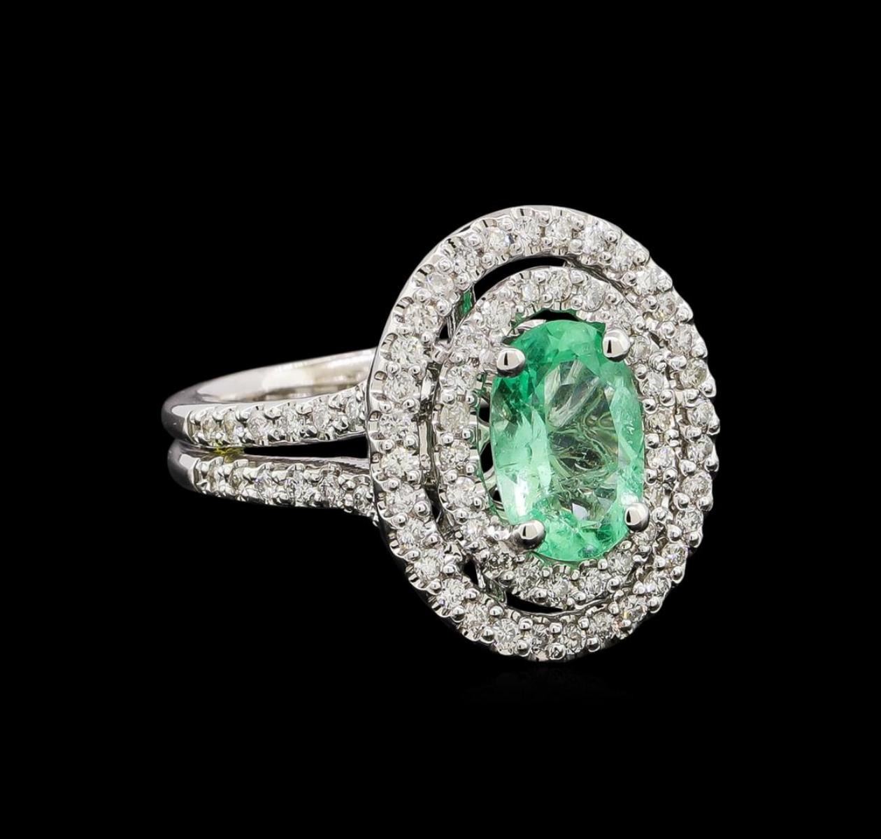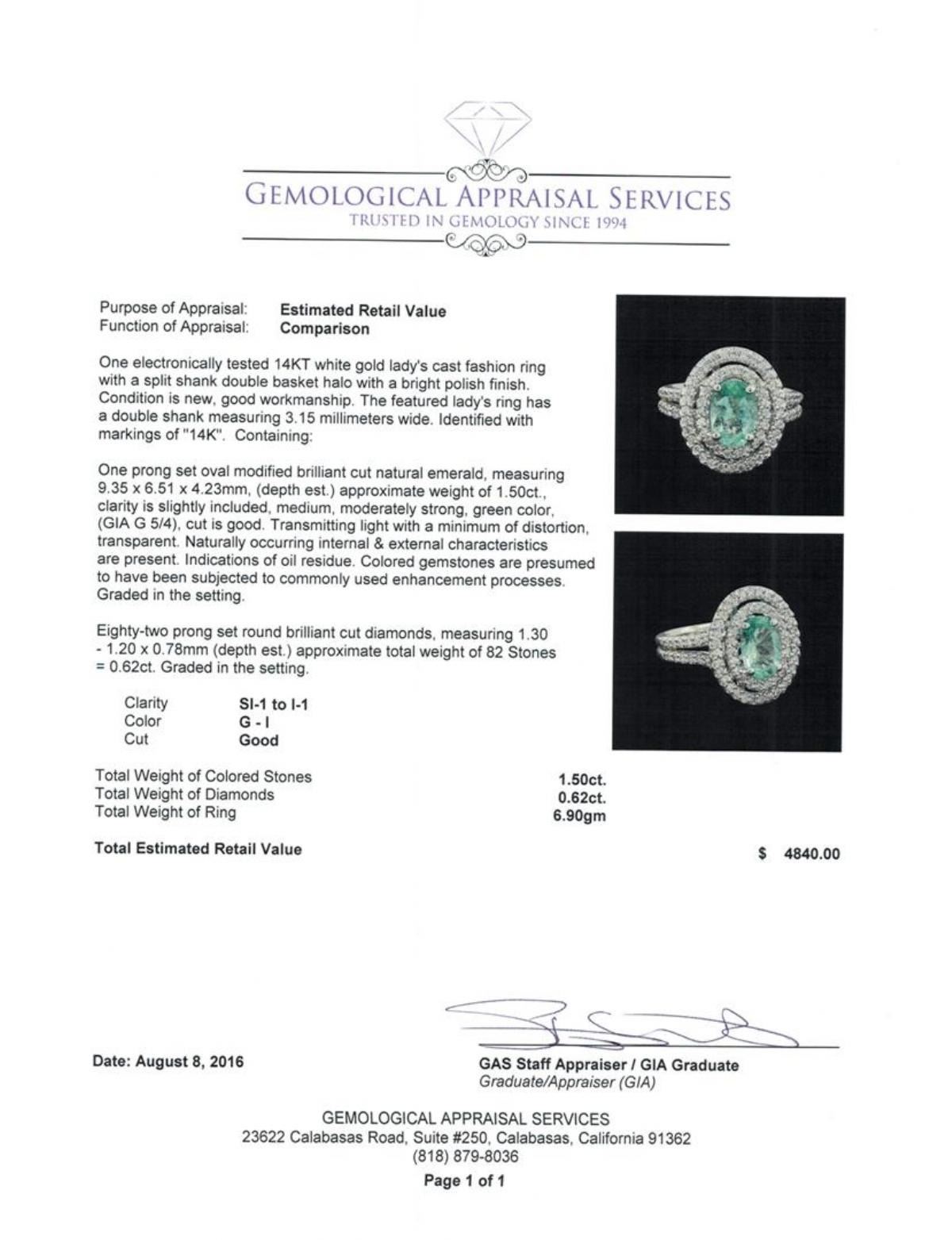 One electronically tested 14KT white gold lady's cast fashion ring with a split shank double basket halo with a bright polish finish. The featured lady's ring has a double shank measuring 3.15 millimeters wide. Identified with markings of '14K'. Condition is new, good workmanship. Containing: One prong set oval modified brilliant cut natural emerald, measuring 9.35 x 6.51 x 4.23mm, (depth est.) approximate weight of 1.50ct., clarity is slightly included, medium, moderately strong, green color, (GIA G 5/4), cut is good. Transmitting light with a minimum of distortion, transparent. Naturally occurring internal & external characteristics are present. Indications of oil residue. Colored gemstones are presumed to have been subjected to commonly used enhancement processes. Graded in the setting. Eighty-Two prong set round brilliant cut diamonds, measuring 1.30 - 1.20 x 0.78mm (depth est.) approximate total weight of 82 Stones = 0.62ct. Graded in the setting. Clarity SI-1 to I-1. Color: G - I Cut Good. Total Weight of Colored Stones 1.50ct.. Total Weight of Diamonds 0.62ct.. Total Weight of Ring 6.90gm. GAS Appraised.