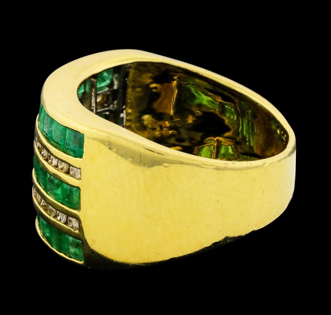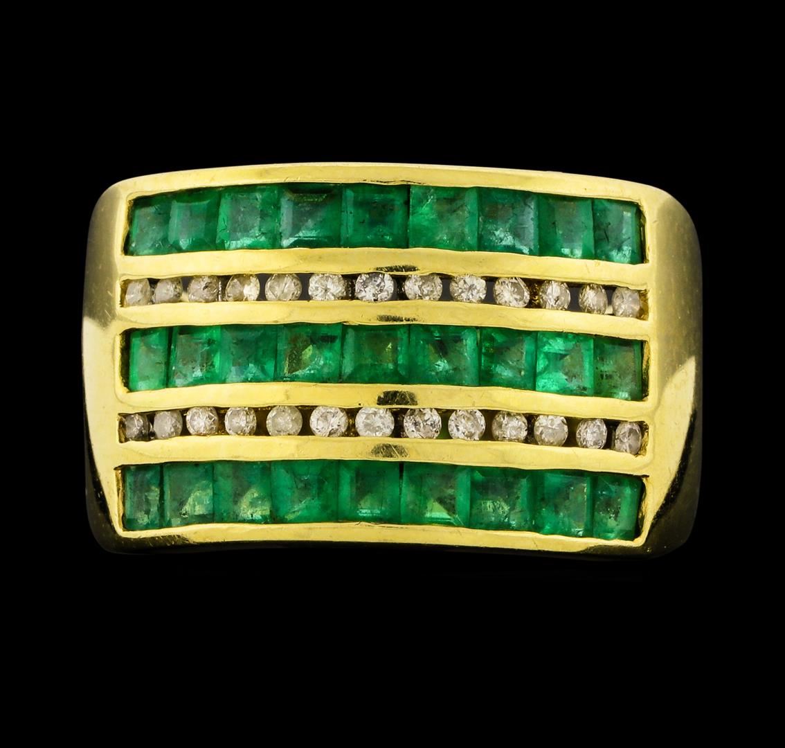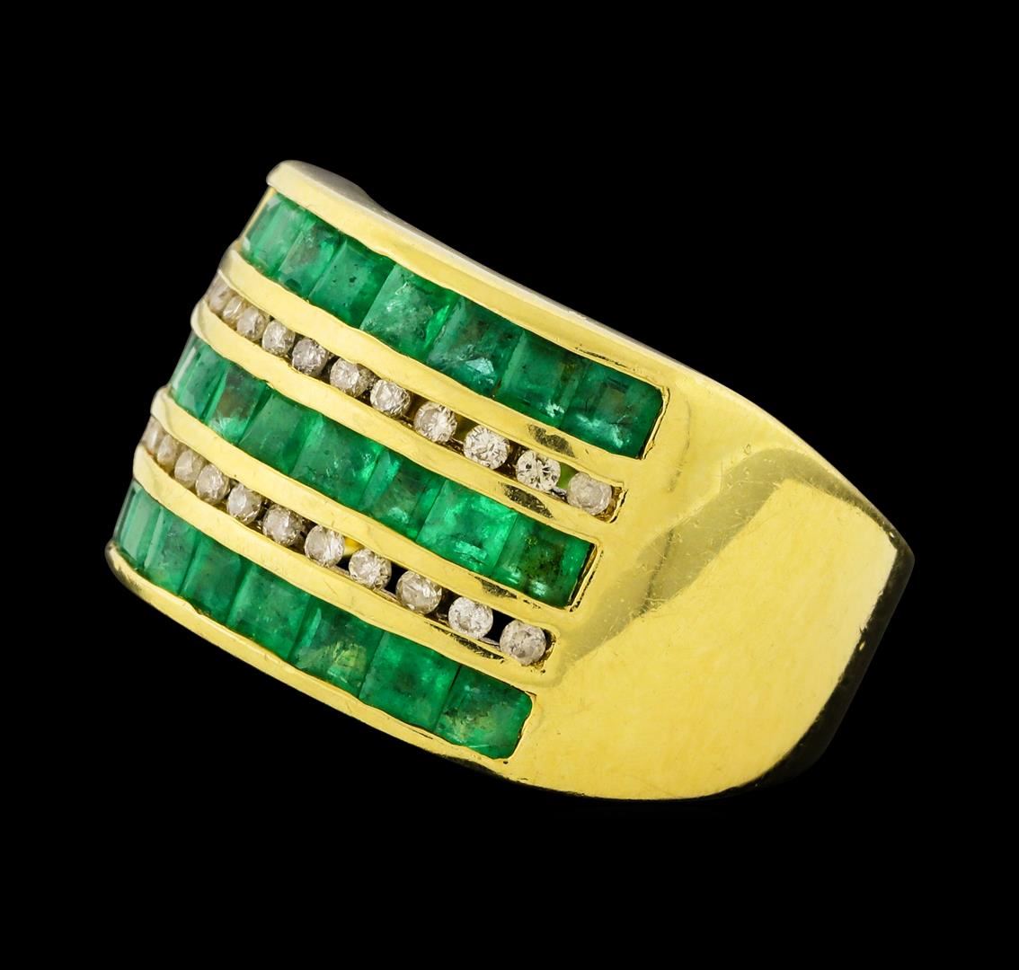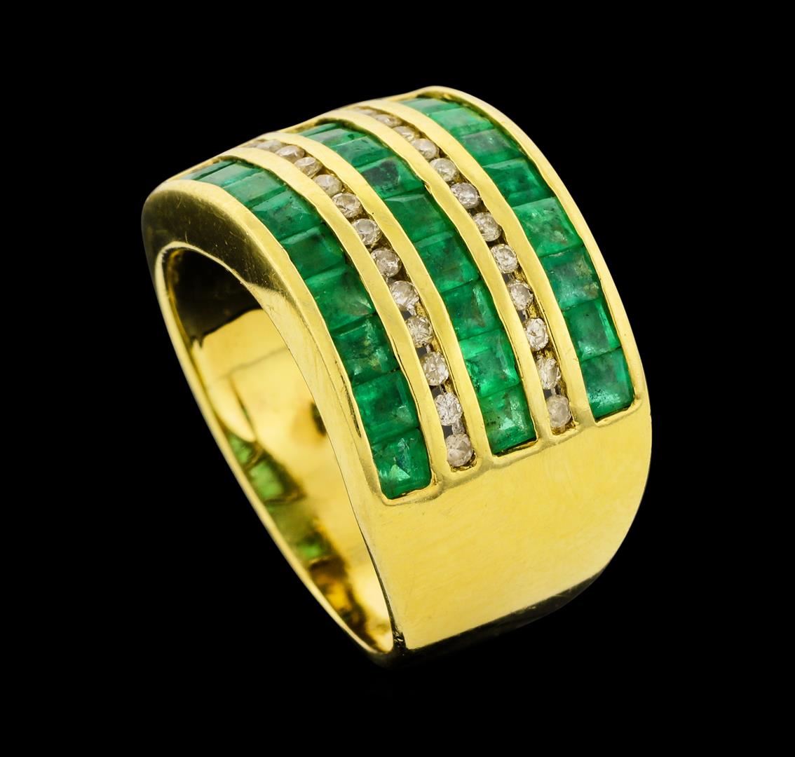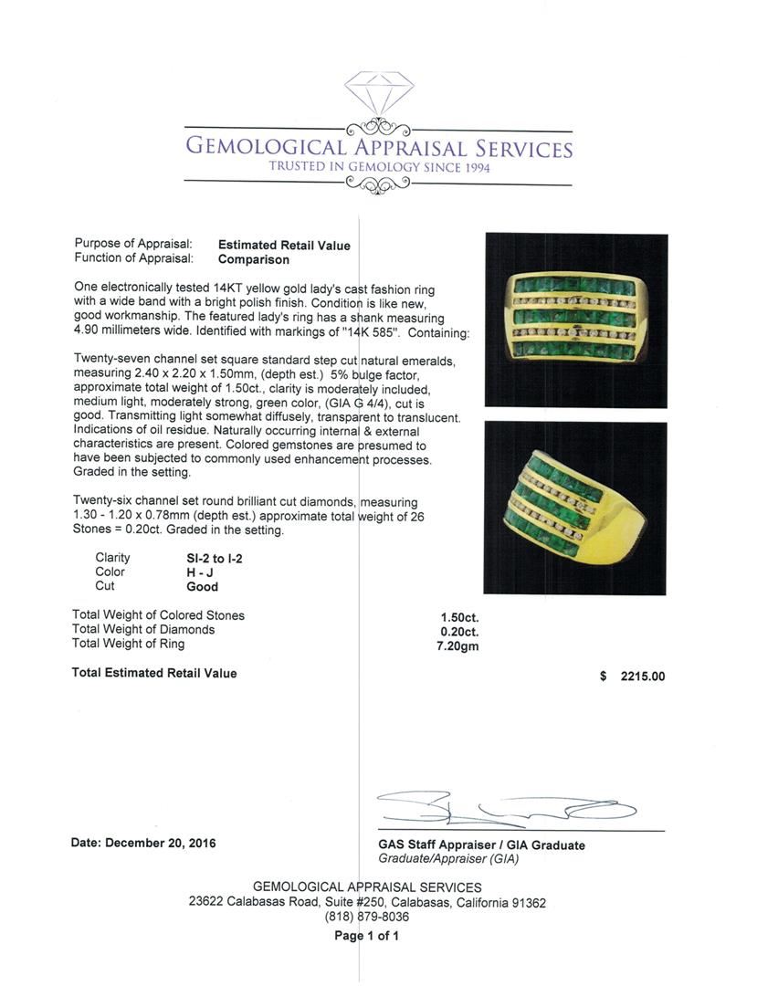 One electronically tested 14KT yellow gold lady's cast fashion ring with a wide band with a bright polish finish. The featured lady's ring has a shank measuring 4.90 millimeters wide. Identified with markings of '14K 585'. Condition is like new, good workmanship. Containing: Twenty-seven channel set square standard step cut natural emeralds, measuring 2.40 x 2.20 x 1.50mm, (depth est.) 5%. bulge factor, approximate total weight of 1.50ct., clarity is moderately included, medium light, moderately strong, green color, (GIA G 4/4), cut is good. Transmitting light somewhat diffusely, transparent to translucent. Indications of oil residue. Naturally occurring internal & external characteristics are present. Colored gemstones are presumed to have been subjected to commonly used enhancement processes. Graded in the setting. Twenty-Six channel set round brilliant cut diamonds, measuring 1.30 - 1.20 x 0.78mm (depth est.) approximate total weight of 26 Stones = 0.20ct. Graded in the setting. Clarity SI-2 to I-2. Color: H - J Cut Good. Total Weight of Colored Stones 1.50ct.. Total Weight of Diamonds 0.20ct.. Total Weight of Ring 7.20gm. GAS Appraised at $2,215.00.