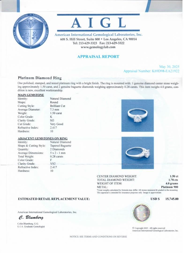 One polished, stamped, and tested platinum ring with a bright finish. The ring is mounted with: 1 genuine diamond center stone weighing approximately 1.50 carat, and 2 genuine baguette diamonds weighing approximately 0.28 carats. This item weighs 4.0 grams, condition is new, excellent workmanship. #MAIN GEMSTONE# Identity: Natural Diamond; Shape: Round; Cutting Style: Brilliant Cut; Average Diameter: 7.3mm; Weight: 1.50 carat; Color Grade: K; Clarity Grade: SI3; Cut Grade: Very Good; Refractive Index: 2.417; Hardness: 10 #ADJACENT GEMSTONES ON RING# Identity: Natural Diamond; Shape & Cutting Style: Tapered Baguette; Quantity: 2 Diamonds; Average Dimensions: 5 x 2 - 1mm; Total Weight: 0.28 carats; Color Grade: F; Clarity Grade: VS2; Refractive Index: 2.417; Hardness: 10 #CENTER DIAMOND WEIGHT: 1.50 ct; TOTAL DIAMOND WEIGHT: 1.78 cts; WEIGHT OF ITEM: 4.0 grams; METAL: Platinum 900 #Size: 7 3/4