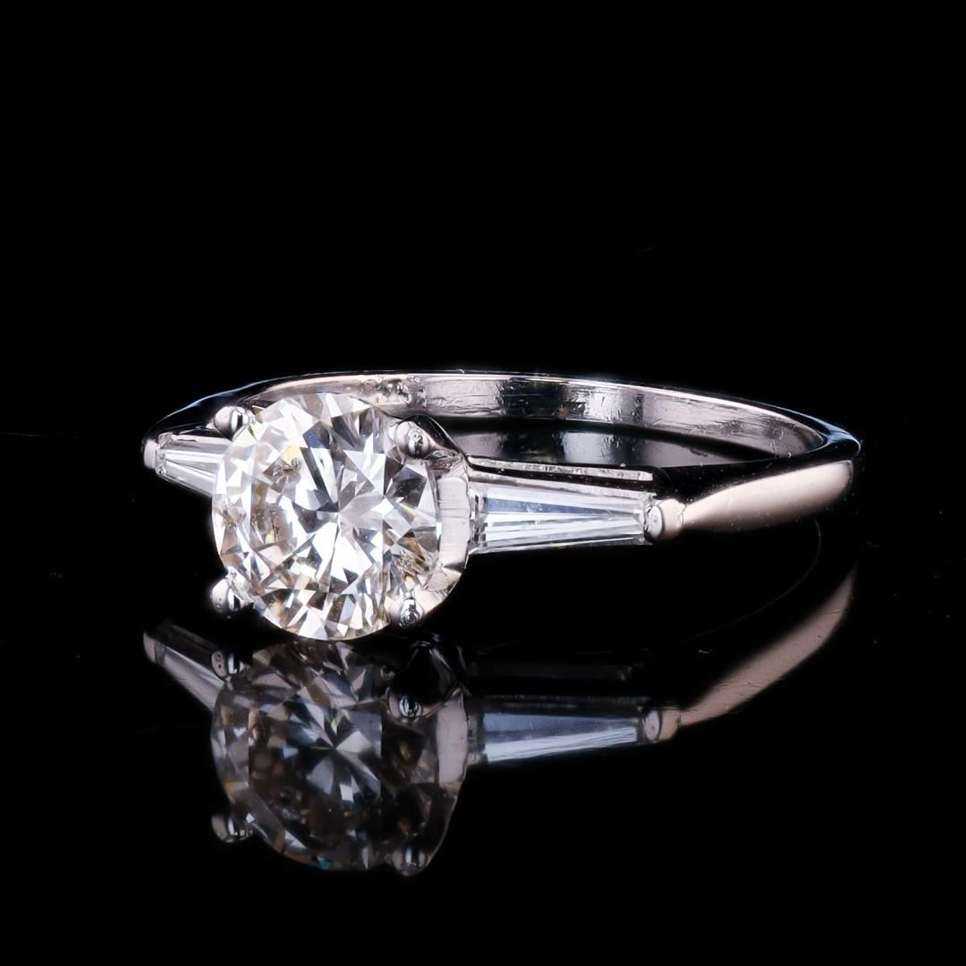 One polished, stamped, and tested platinum ring with a bright finish. The ring is mounted with: 1 genuine diamond center stone weighing approximately 1.50 carat, and 2 genuine baguette diamonds weighing approximately 0.28 carats. This item weighs 4.0 grams, condition is new, excellent workmanship. #MAIN GEMSTONE# Identity: Natural Diamond; Shape: Round; Cutting Style: Brilliant Cut; Average Diameter: 7.3mm; Weight: 1.50 carat; Color Grade: K; Clarity Grade: SI3; Cut Grade: Very Good; Refractive Index: 2.417; Hardness: 10 #ADJACENT GEMSTONES ON RING# Identity: Natural Diamond; Shape & Cutting Style: Tapered Baguette; Quantity: 2 Diamonds; Average Dimensions: 5 x 2 - 1mm; Total Weight: 0.28 carats; Color Grade: F; Clarity Grade: VS2; Refractive Index: 2.417; Hardness: 10 #CENTER DIAMOND WEIGHT: 1.50 ct; TOTAL DIAMOND WEIGHT: 1.78 cts; WEIGHT OF ITEM: 4.0 grams; METAL: Platinum 900 #Size: 7 3/4