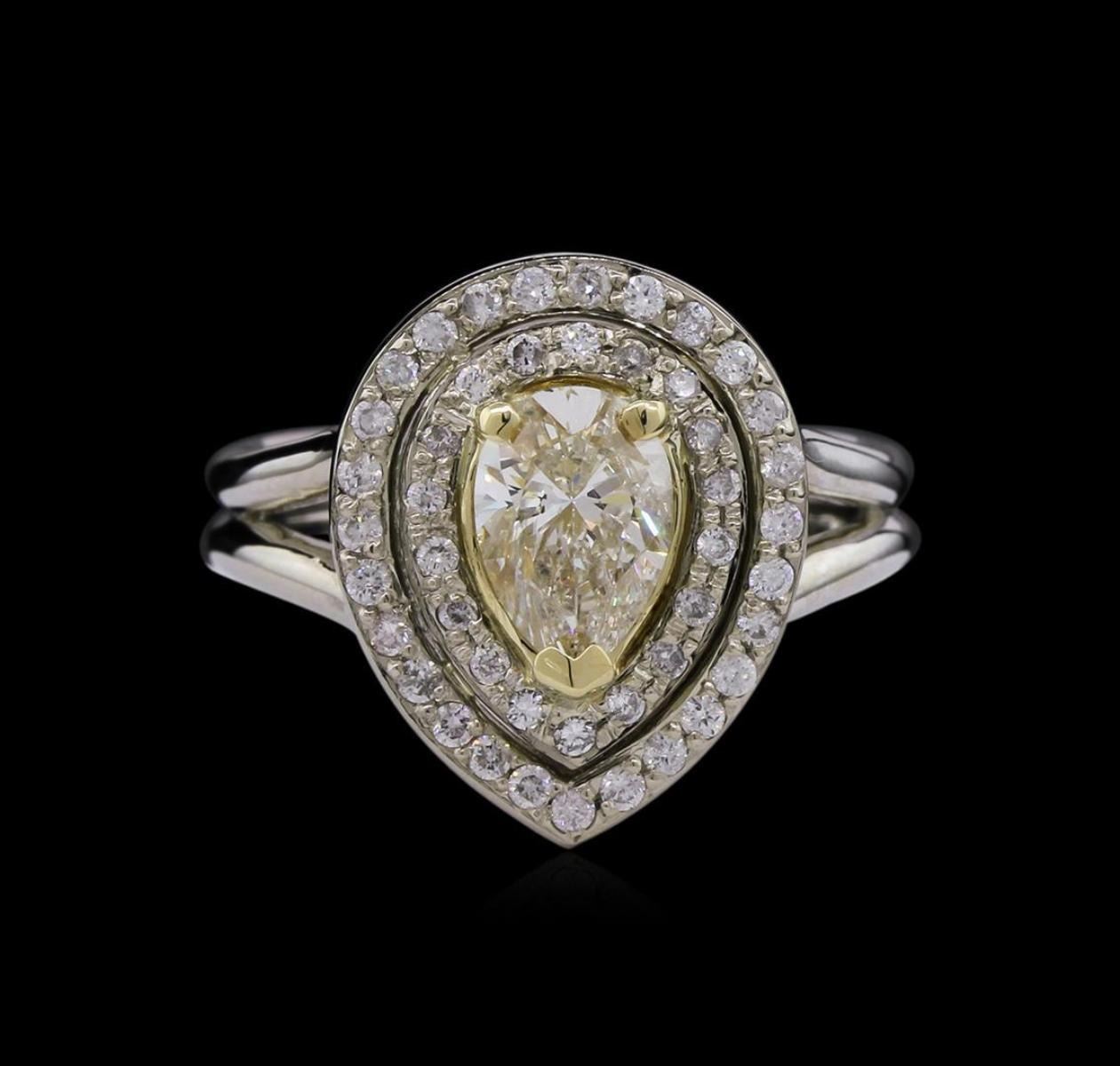 One electronically tested 14KT white and yellow gold lady's combination cast & assembled wedding ring with a double split shank with a bright polish finish. The featured lady's ring has a double halo and a shank measuring 3.73 millimeters wide. Identified with markings of "14K". Condition is new, good workmanship. Containing: One prong set pear shaped cut diamond, measuring 8.00 x 5.50 x 3.61mm (depth est.) , 5.00.%. GTCF approximate weight of 1.00ct. Graded in the setting. Clarity: I-1 Cut Very Good Sixty-Four prong set round brilliant cut diamonds, measuring 1.30 - 1.20 x 0.81mm (depth est.) approximate total weight of 64 Stones = 0.50ct. Graded in the setting. Clarity: SI-1 to I-1. Color: H - I. Cut Good. Total Weight of Diamonds 1.50ct. Total Weight of Ring 7.90gm. GAS Appraised.