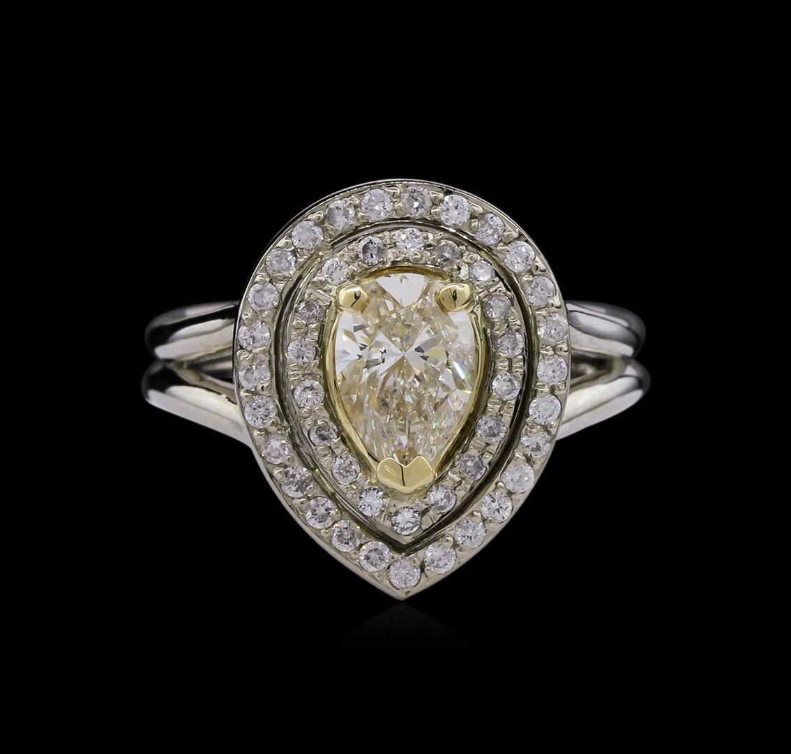 One electronically tested 14KT white and yellow gold lady's combination cast & assembled wedding ring with a double split shank with a bright polish finish. The featured lady's ring has a double halo and a shank measuring 3.73 millimeters wide. Identified with markings of "14K". Condition is new, good workmanship. Containing: One prong set pear shaped cut diamond, measuring 8.00 x 5.50 x 3.61mm (depth est.) , 5.00.%. GTCF approximate weight of 1.00 ct. Graded in the setting. Clarity: I-1 Cut Very Good Sixty-Four prong set round brilliant cut diamonds, measuring 1.30 - 1.20 x 0.81mm (depth est.) approximate total weight of 64 Stones = 0.50 ct. Graded in the setting. Clarity: SI-1 to I-1. Color: H - I. Cut Good. Total Weight of Diamonds 1.50 ct. Total Weight of Ring 7.90gm. GAS Appraised.
