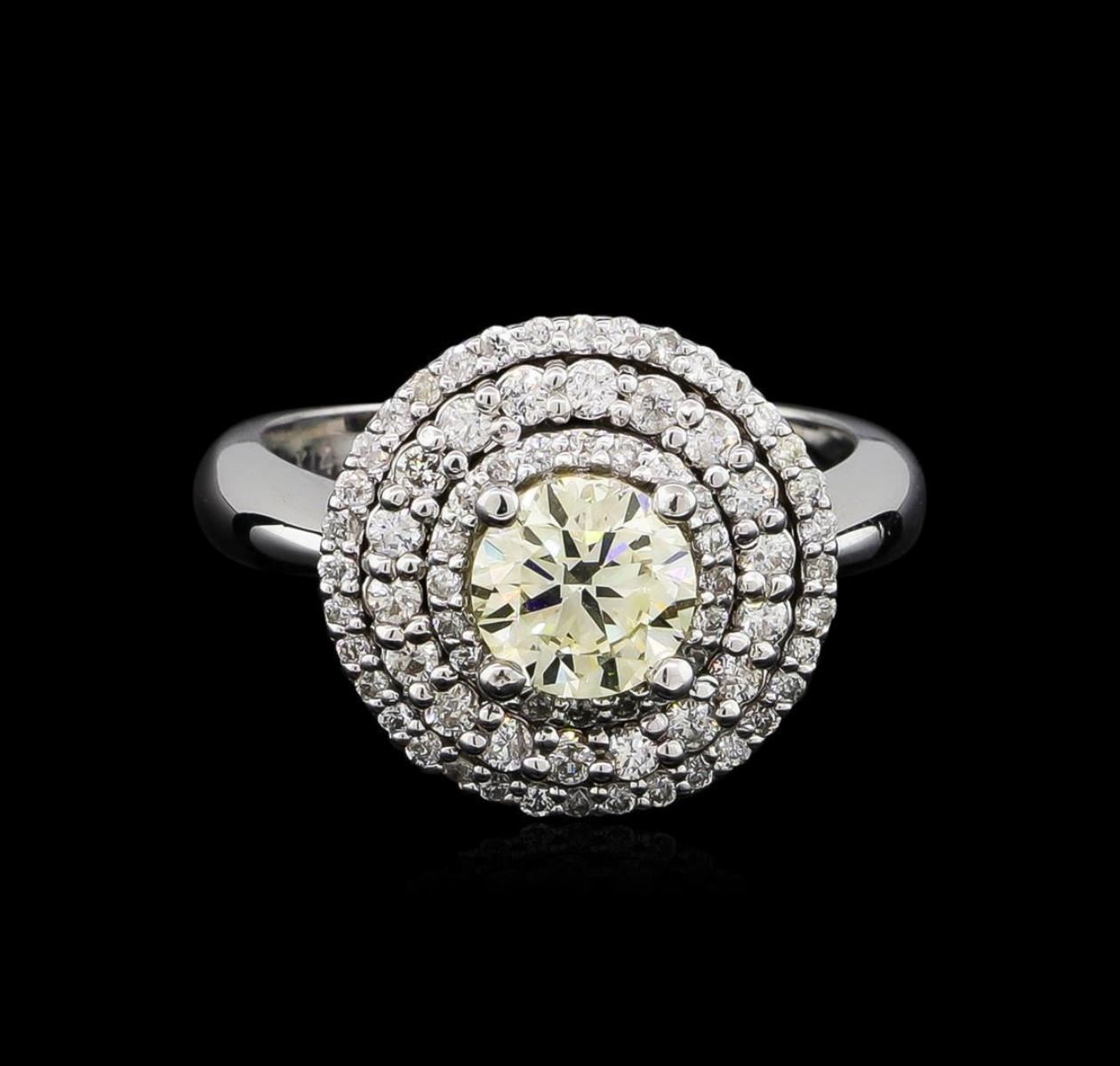 One electronically tested 14KT white gold ladies cast diamond unity ring with a bright polish finish. The featured diamond is set within tiered diamond bezels supported by an elaborate lattice under gallery, completed by a two millimeter wide band. Identified with markings of "K14". Condition is new, good workmanship. Containing: One prong set round brilliant cut diamond, measuring 6.34 - 6.30 x 3.86mm exact weight 1.01ct. Brown secondary color throughout. Measured loose prior to setting. Graded in the setting. Clarity: VS-2. Depth: 61.1%. Table 61.0%. Pavil. Depth%. 42.0%. Eighteen prong set round brilliant cut diamonds, measuring 1.50 - 1.50 x 0.90mm (depth est.) approximate total weight of 18 Stones = 0.24ct. Graded in the setting. Clarity: SI-2 to I-2. Color: G - H Fifty-Six prong set round brilliant cut diamonds, measuring 1.00 - 1.00 x 0.60mm (depth est.) approximate total weight of 56 Stones = 0.25ct. Graded in the setting. Clarity: SI-2 to I-2. Color: G - I. Total Weight of Diamonds 1.50ct. Total Weight of Ring 6.32gm. AIG Appraised.