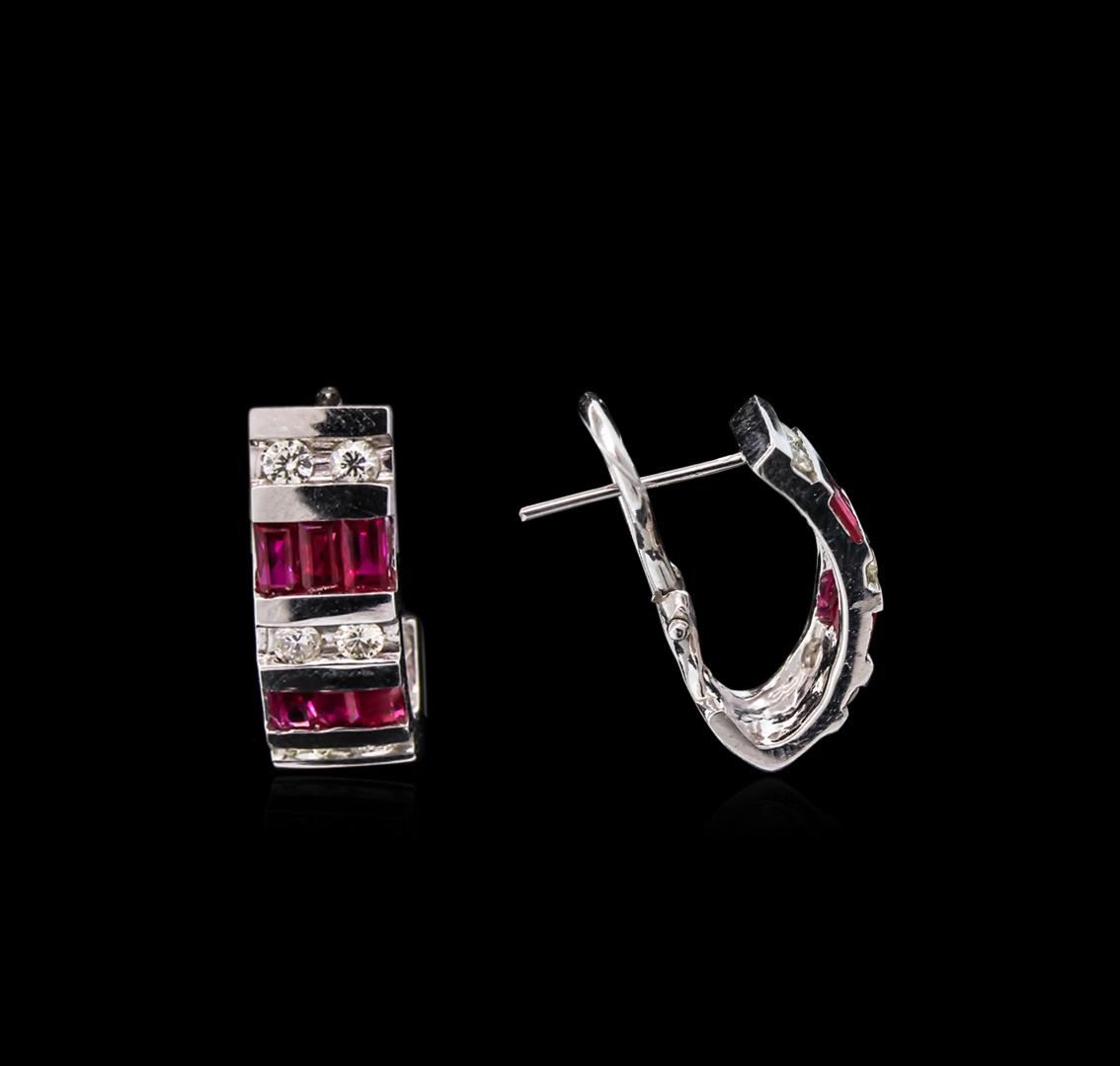 One pair of earrings featuring: 14KT white gold weighing 7.00 grams containing rubies with a total weight of 1.50ct and diamonds with a total weight of 0.56ct.