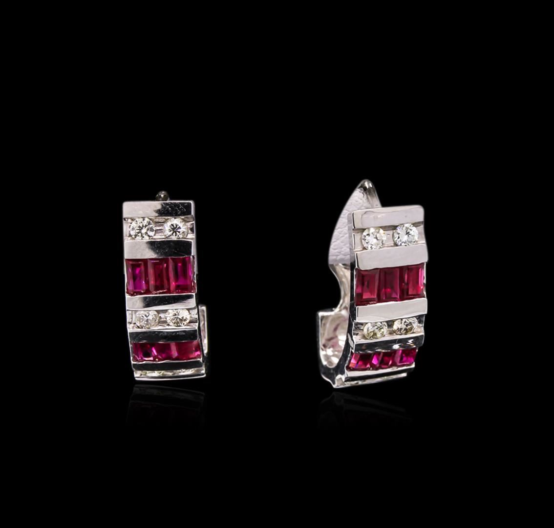 One pair of earrings featuring: 14KT white gold weighing 7.00 grams containing rubies with a total weight of 1.50ct and diamonds with a total weight of 0.56ct.