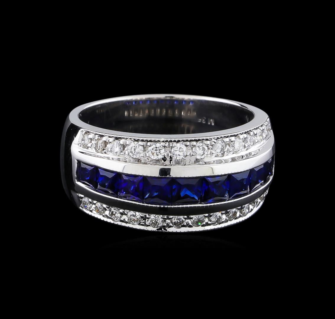One electronically tested 18KT white gold lady's cast fashion ring with a tapered shank with a bright polish with milgrain detailing finish. The featured lady's ring has a shank measuring 6.25 millimeters wide. Condition is new, good workmanship. Containing: Ten channel set princess modified brilliant cut natural blue sapphires, measuring 3.00 x 2.70 x 1.89mm, approximate total weight of 1.50ct., clarity is eye clean, type II, medium dark, moderately strong, blue color, (GIA B 6/4), cut is very good. Transmitting light with no distortion, transparent. Colored gemstones are presumed to have been subjected to commonly used enhancement processes. Graded in the setting. Twenty-Six bead set round brilliant cut diamonds, measuring 1.60 - 1.50 x 0.97mm (depth est.) approximate total weight of 26 Stones = 0.37ct. Graded in the setting. Clarity: VS-2 to SI-2. Color: G - Good. Total Weight of Colored Stones 1.50ct. Total Weight of Diamonds 0.37ct. Total Weight of Ring 11.50gm. GAS Appraised at $4,550.00.