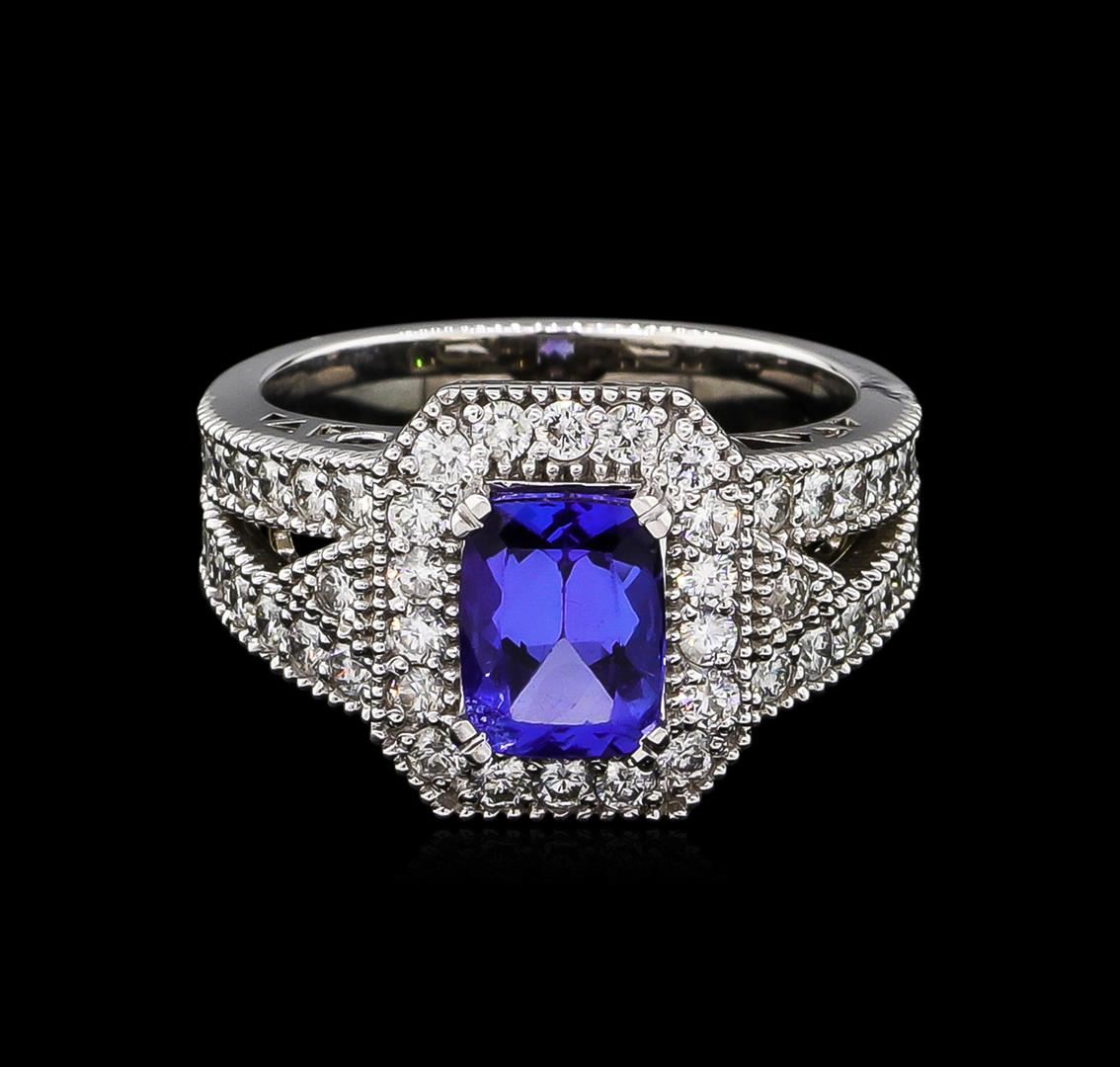 One electronically tested 14KT white gold lady's cast fashion halo ring with a cathedral shank with a halo with a bright polish with milgrain detailing finish. The featured lady's ring has a shank measuring 4.06 millimeters wide. Identified with markings of "K14". Condition is new, good workmanship. Containing: One prong set rectangular cushion modified brilliant cut natural tanzanite, measuring 7.87 x 5.95 x 4.00mm, approximate weight of 1.50ct., clarity is slightly included, type I, medium dark, moderately strong, violetish blue color, (GIA vB 6/4), cut is very good. Transmitting light with a minimum of distortion, transparent. Colored gemstones are presumed to have been subjected to commonly used enhancement processes. Graded in the setting. Forty-Eight prong set round brilliant cut diamonds, measuring 1.80 - 1.75 x 1.12mm (depth est.) approximate total weight of 48 Stones = 1.04ct. Graded in the setting. Clarity: SI-1 to I-1. Color: H - I. Cut Good. Total Weight of Colored Stones 1.50ct. Total Weight of Diamonds 1.04ct. Total Weight of Ring 8.00gm. GAS Appraised at $5,760.00.