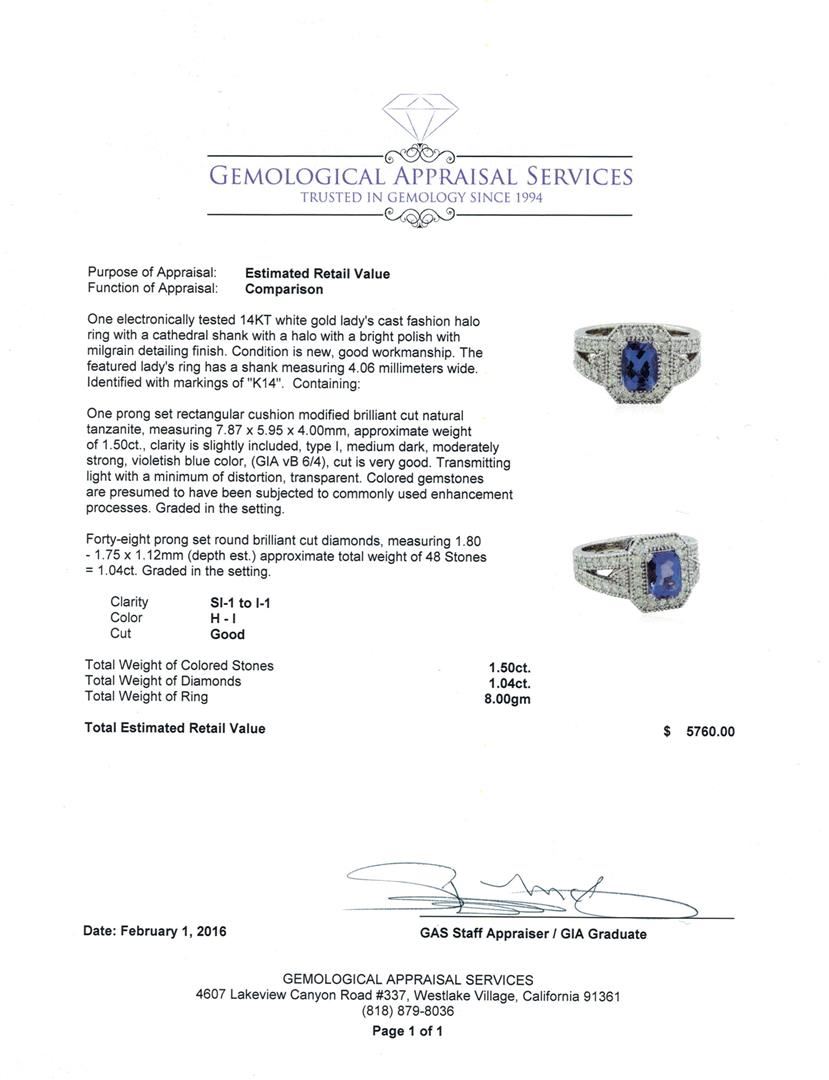 One electronically tested 14KT white gold lady's cast fashion halo ring with a cathedral shank with a halo with a bright polish with milgrain detailing finish. The featured lady's ring has a shank measuring 4.06 millimeters wide. Identified with markings of "K14". Condition is new, good workmanship. Containing: One prong set rectangular cushion modified brilliant cut natural tanzanite, measuring 7.87 x 5.95 x 4.00mm, approximate weight of 1.50ct., clarity is slightly included, type I, medium dark, moderately strong, violetish blue color, (GIA vB 6/4), cut is very good. Transmitting light with a minimum of distortion, transparent. Colored gemstones are presumed to have been subjected to commonly used enhancement processes. Graded in the setting. Forty-Eight prong set round brilliant cut diamonds, measuring 1.80 - 1.75 x 1.12mm (depth est.) approximate total weight of 48 Stones = 1.04ct. Graded in the setting. Clarity: SI-1 to I-1. Color: H - I. Cut Good. Total Weight of Colored Stones 1.50ct. Total Weight of Diamonds 1.04ct. Total Weight of Ring 8.00gm. GAS Appraised at $5,760.00.