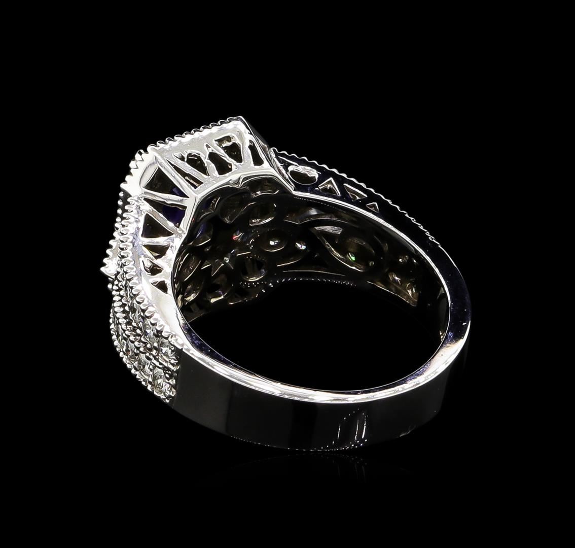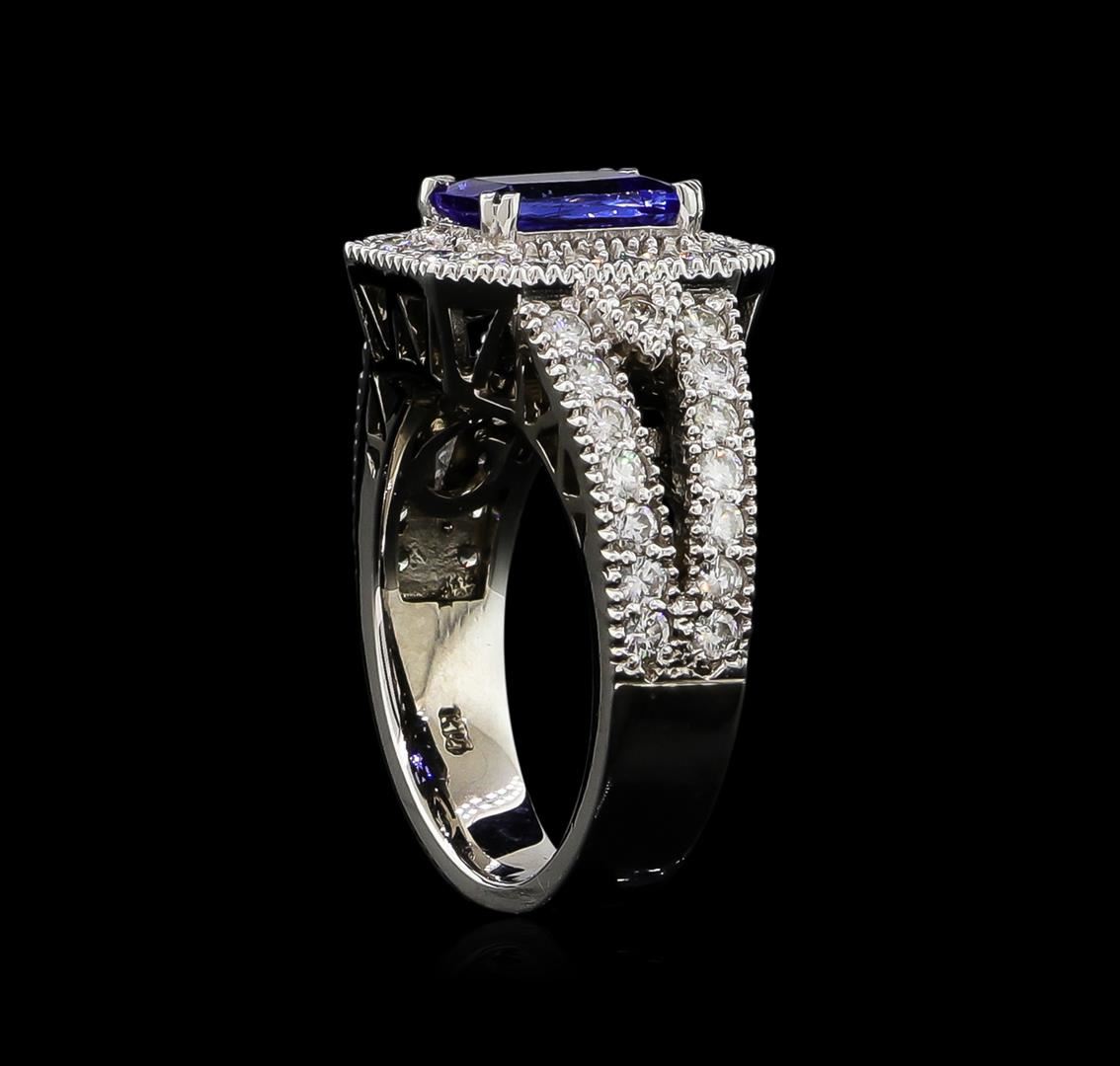 One electronically tested 14KT white gold lady's cast fashion halo ring with a cathedral shank with a halo with a bright polish with milgrain detailing finish. The featured lady's ring has a shank measuring 4.06 millimeters wide. Identified with markings of "K14". Condition is new, good workmanship. Containing: One prong set rectangular cushion modified brilliant cut natural tanzanite, measuring 7.87 x 5.95 x 4.00mm, approximate weight of 1.50ct., clarity is slightly included, type I, medium dark, moderately strong, violetish blue color, (GIA vB 6/4), cut is very good. Transmitting light with a minimum of distortion, transparent. Colored gemstones are presumed to have been subjected to commonly used enhancement processes. Graded in the setting. Forty-Eight prong set round brilliant cut diamonds, measuring 1.80 - 1.75 x 1.12mm (depth est.) approximate total weight of 48 Stones = 1.04ct. Graded in the setting. Clarity: SI-1 to I-1. Color: H - I. Cut Good. Total Weight of Colored Stones 1.50ct. Total Weight of Diamonds 1.04ct. Total Weight of Ring 8.00gm. GAS Appraised at $5,760.00.