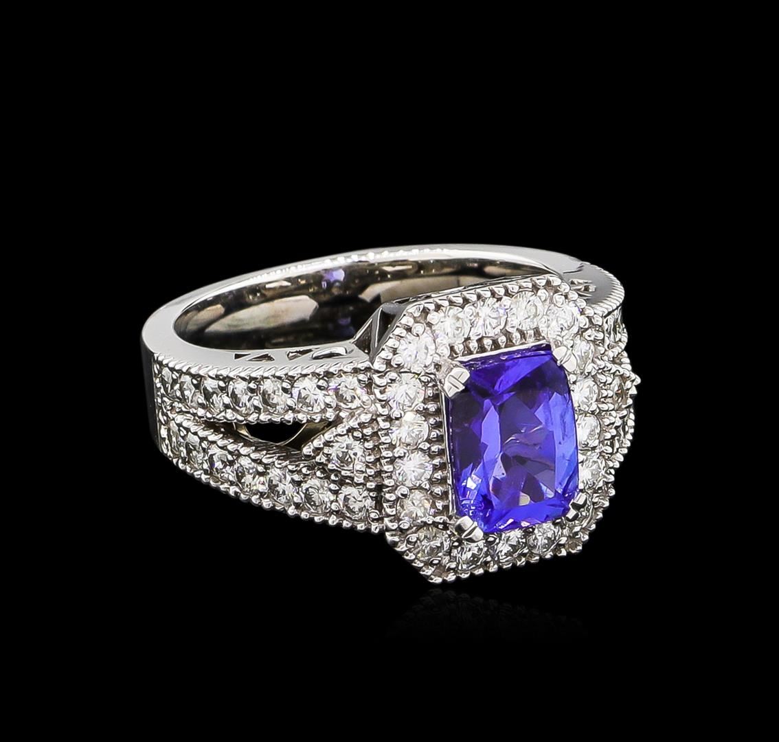 One electronically tested 14KT white gold lady's cast fashion halo ring with a cathedral shank with a halo with a bright polish with milgrain detailing finish. The featured lady's ring has a shank measuring 4.06 millimeters wide. Identified with markings of "K14". Condition is new, good workmanship. Containing: One prong set rectangular cushion modified brilliant cut natural tanzanite, measuring 7.87 x 5.95 x 4.00mm, approximate weight of 1.50ct., clarity is slightly included, type I, medium dark, moderately strong, violetish blue color, (GIA vB 6/4), cut is very good. Transmitting light with a minimum of distortion, transparent. Colored gemstones are presumed to have been subjected to commonly used enhancement processes. Graded in the setting. Forty-Eight prong set round brilliant cut diamonds, measuring 1.80 - 1.75 x 1.12mm (depth est.) approximate total weight of 48 Stones = 1.04ct. Graded in the setting. Clarity: SI-1 to I-1. Color: H - I. Cut Good. Total Weight of Colored Stones 1.50ct. Total Weight of Diamonds 1.04ct. Total Weight of Ring 8.00gm. GAS Appraised at $5,760.00.