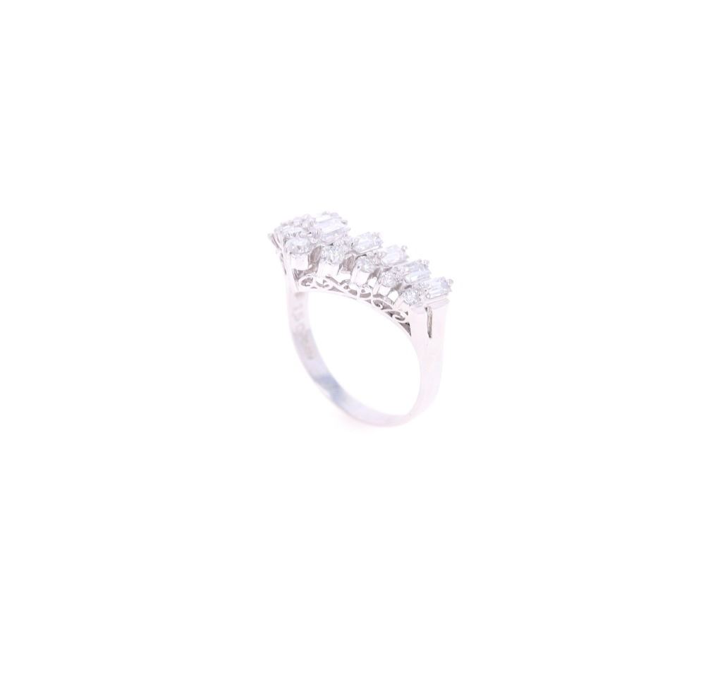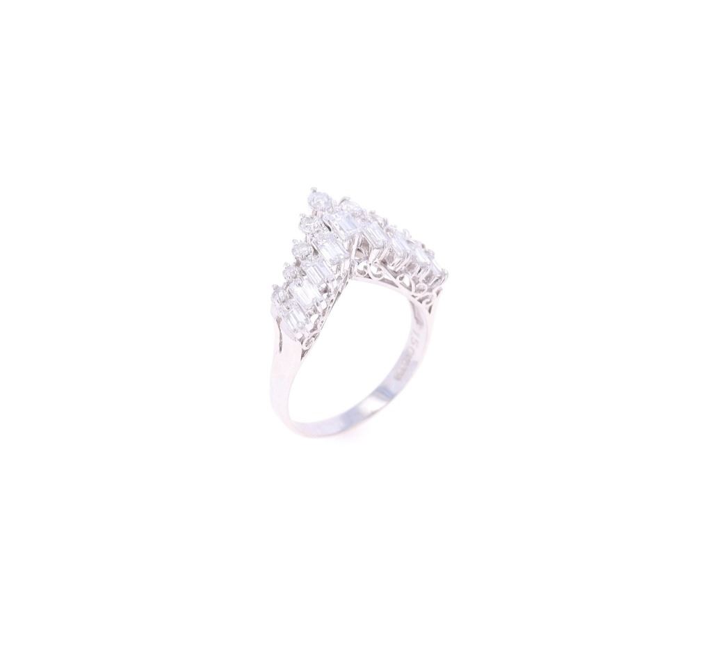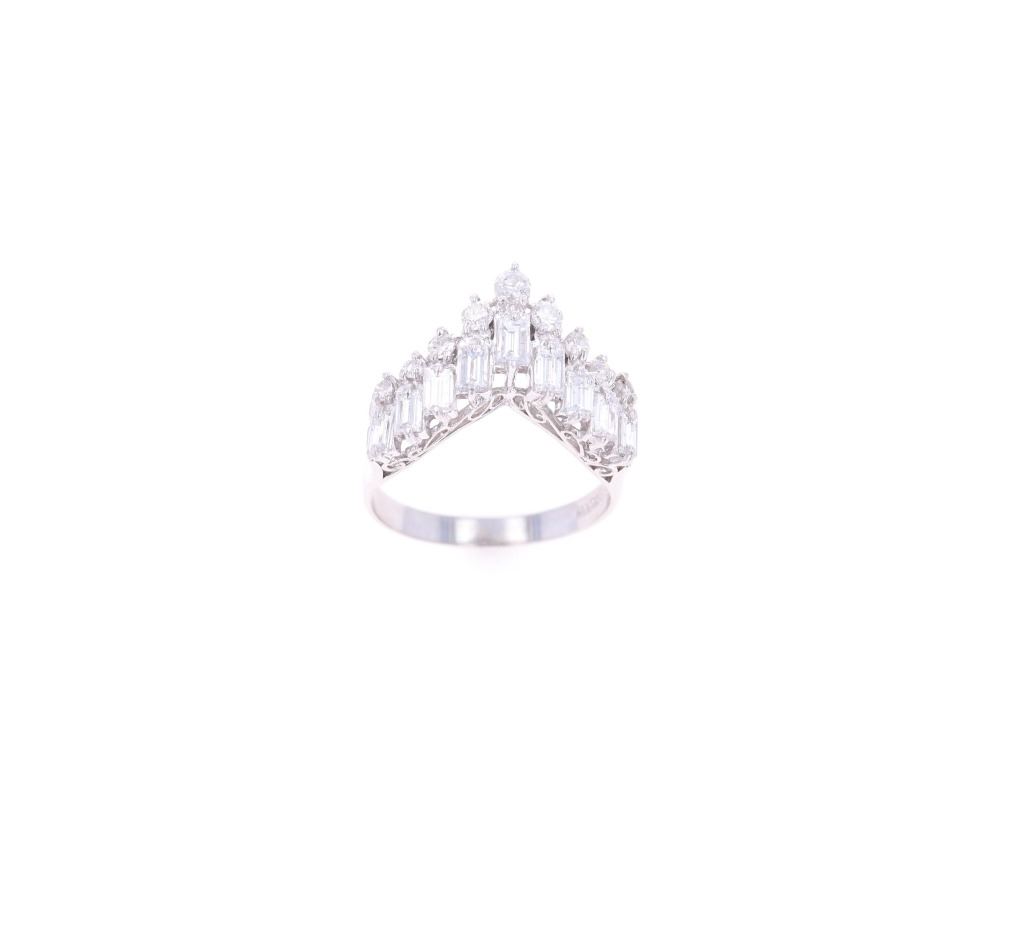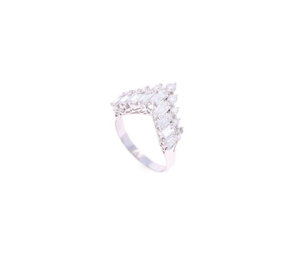 Featured in this lot is this 1.50ct VS1 baguette and round diamond platinum ring with GGA paperwork. The ring features a polished, stamped, and tested platinum construction and is marked as follows: 1.50 - PT950. The ring features a 'V' accent that is decorated with a total of 9 baguette and 9round brilliant cut diamonds that shows dimensions of 4 - 1.8mm with thin-thick, faceted and shows F - G color and VS1 - SI2 clarity with a total diamond weight of 1.50cts. The piece comes complete with GGA(GemAssure Gemological Appraisals, GGA Appraisal Number#: GGA071508 and trace number: RN037172) report and appraisal confirming the above info and giving a total value of $8,590.00. The collective weight of this ring is 6.2g and the ring size is US 7 1/2". RN037172.