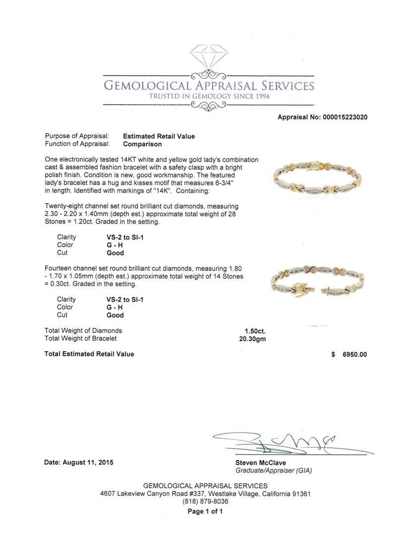One electronically tested 14KT white and yellow gold lady's combination cast & assembled fashion bracelet with a safety clasp with a bright polish finish. The featured lady's bracelet has a hug and kisses motif that measures 6-3/4" in length. Identified with markings of "14K". Condition is new, good workmanship. Containing: Twenty-Eight channel set round brilliant cut diamonds, measuring 2.30 - 2.20 x 1.40mm (depth est.) approximate. Total Weight of 28 Stones = 1.20ct. Graded in the setting. Clarity: VS-2 to SI-1. Color: G - Good Fourteen channel set round brilliant cut diamonds, measuring 1.80 - 1.70 x 1.05mm (depth est.) approximate. Total Weight of 14 Stones = 0.30ct. Graded in the setting. Clarity: VS-2 to SI-1. Color: G - Good. Total Weight of Diamonds 1.50ct. Total Weight of Bracelet 20.30gm. GAS Appraised at $6,950.00.