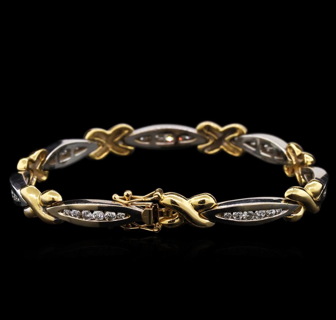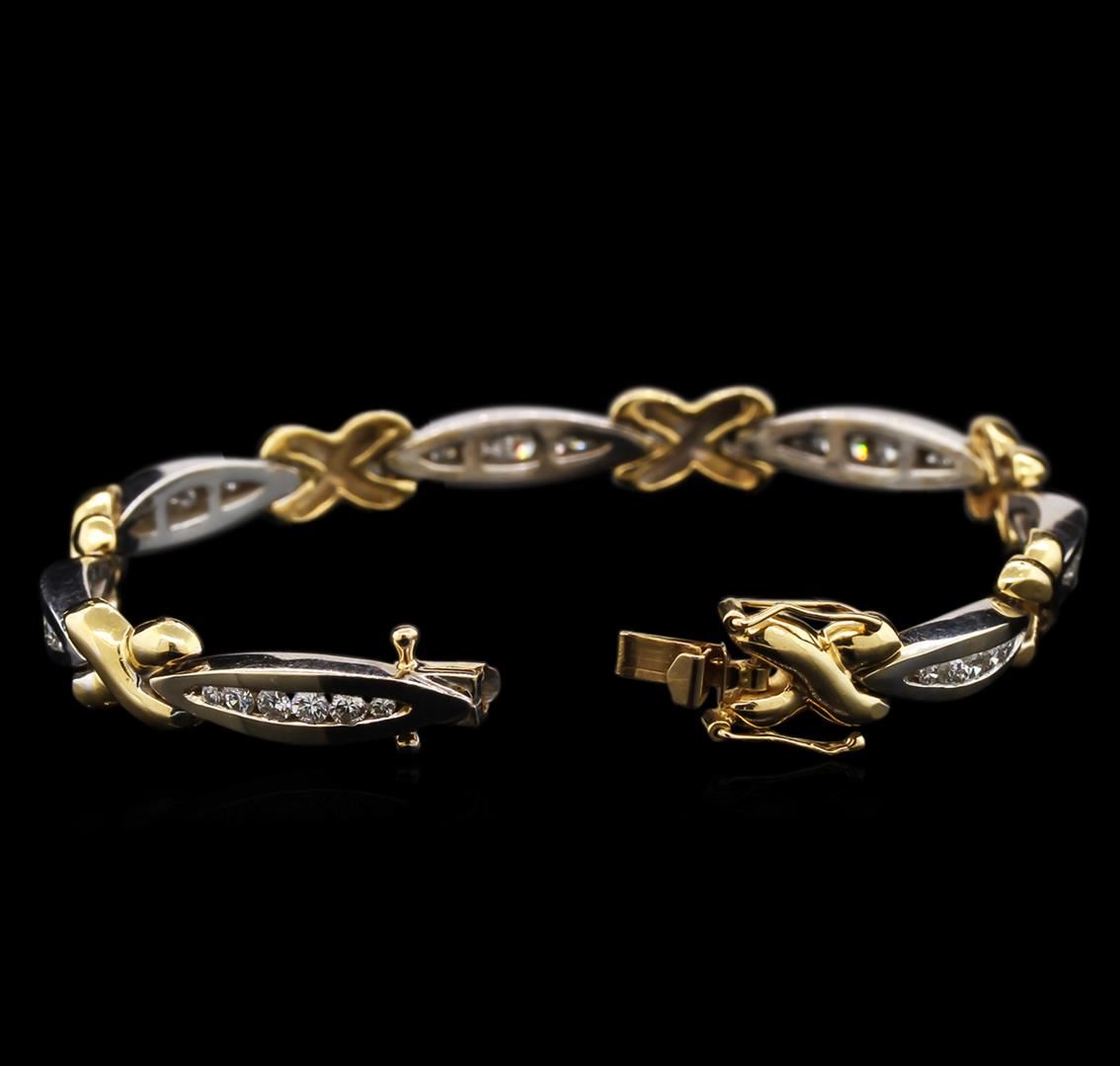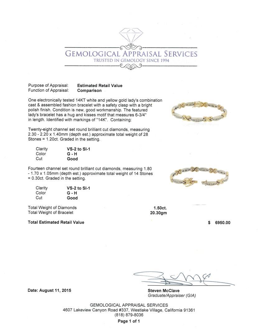 One electronically tested 14KT white and yellow gold lady's combination cast & assembled fashion bracelet with a safety clasp with a bright polish finish. The featured lady's bracelet has a hug and kisses motif that measures 6-3/4" in length. Identified with markings of "14K". Condition is new, good workmanship. Containing: Twenty-Eight channel set round brilliant cut diamonds, measuring 2.30 - 2.20 x 1.40mm (depth est.) approximate. Total Weight of 28 Stones = 1.20ct. Graded in the setting. Clarity: VS-2 to SI-1. Color: G - Good Fourteen channel set round brilliant cut diamonds, measuring 1.80 - 1.70 x 1.05mm (depth est.) approximate. Total Weight of 14 Stones = 0.30ct. Graded in the setting. Clarity: VS-2 to SI-1. Color: G - Good. Total Weight of Diamonds 1.50ct. Total Weight of Bracelet 20.30gm. GAS Appraised at $6,950.00.