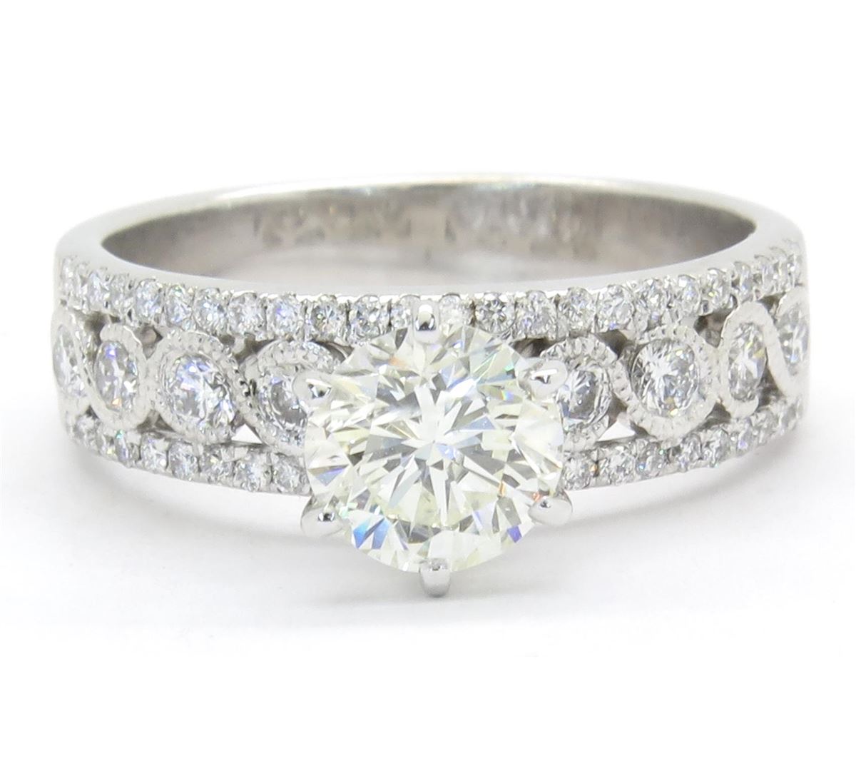 One tested 14K white gold diamond ring. Containing: One Round Brilliant Cut Diamond. Size: .98CT Clarity: I1 Color: J-K. 56 Round Brilliant Cut Diamonds. Approximate total diamond weight: 1.50CTW. Diamonds are graded in the mounting, unless otherwise stated. Weight of ring: 4.9 grams. Size: 6.75.