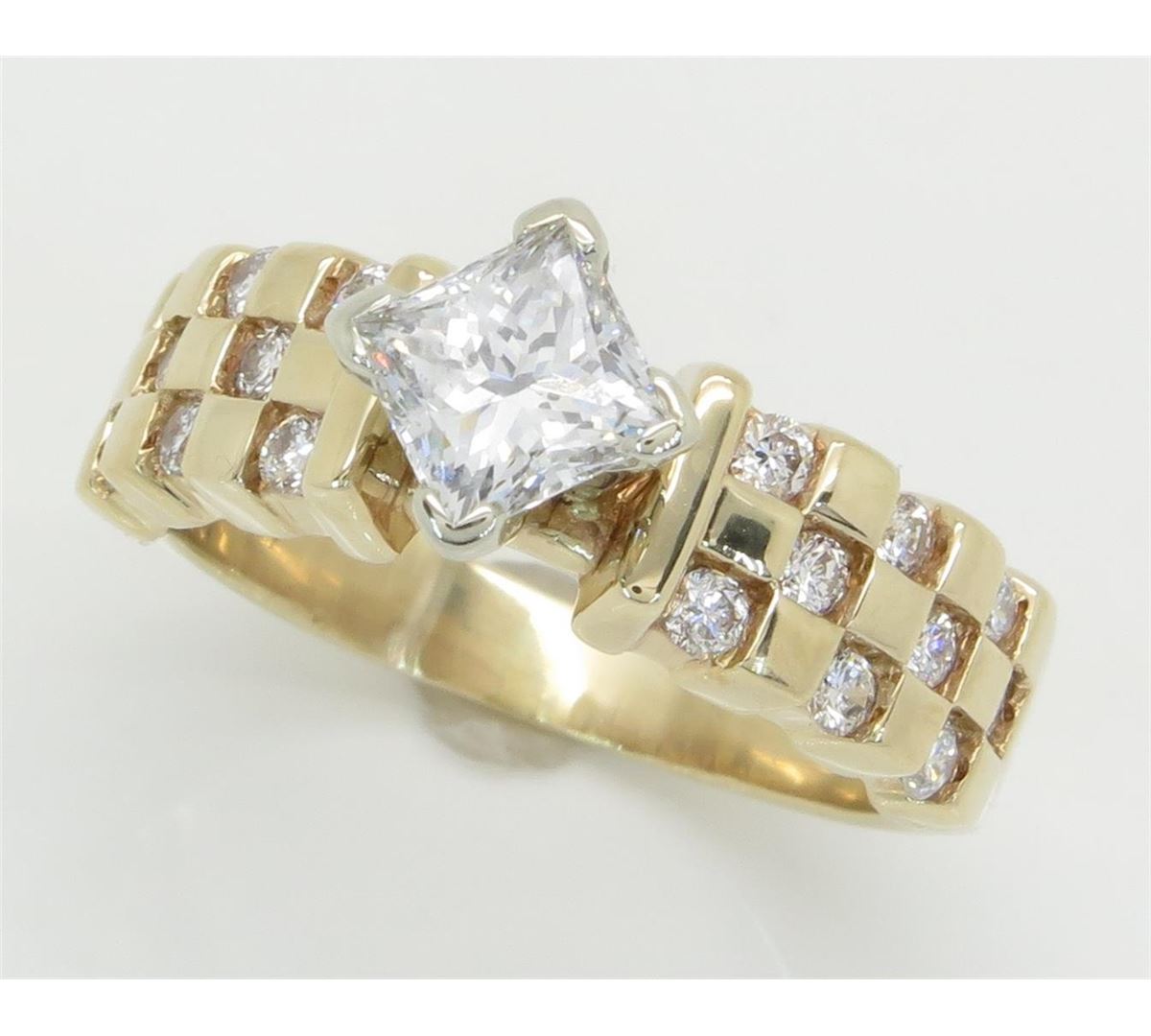 One tested 14K yellow gold diamond ring. Condition is new. Containing: 1 Princess Cut Diamond, Approximate weight: 1.00CT, Clarity: I1, Color: H-I. 18 Round Brilliant Cut Diamonds. Approximate total weight of all diamonds: 1.50CTW. All diamonds are graded in mounting unless otherwise stated. Weight of ring: 7.3 grams, Size: 7.5.