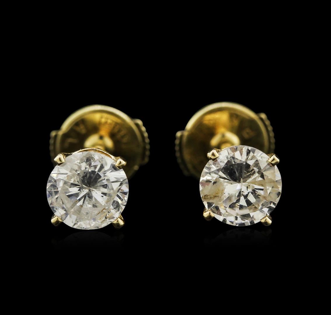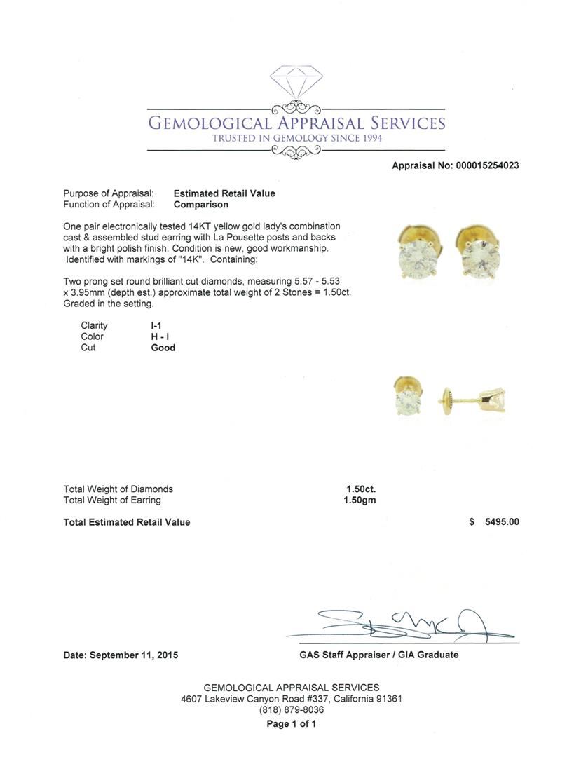 One pair electronically tested 14KT yellow gold lady's combination cast & assembled stud earring with La Pousette posts and backs with a bright polish finish. Identified with markings of "14K". Condition is new, good workmanship. Containing: Two prong set round brilliant cut diamonds, measuring 5.57 - 5.53 x 3.95mm (depth est.) approximate total weight of 2 Stones = 1.50ct. Graded in the setting. Clarity: I-1. Color: H - I. Cut Good. Total Weight of Diamonds 1.50ct. Total Weight of Earring 1.50gm. GAS Appraised at $5,495.00.